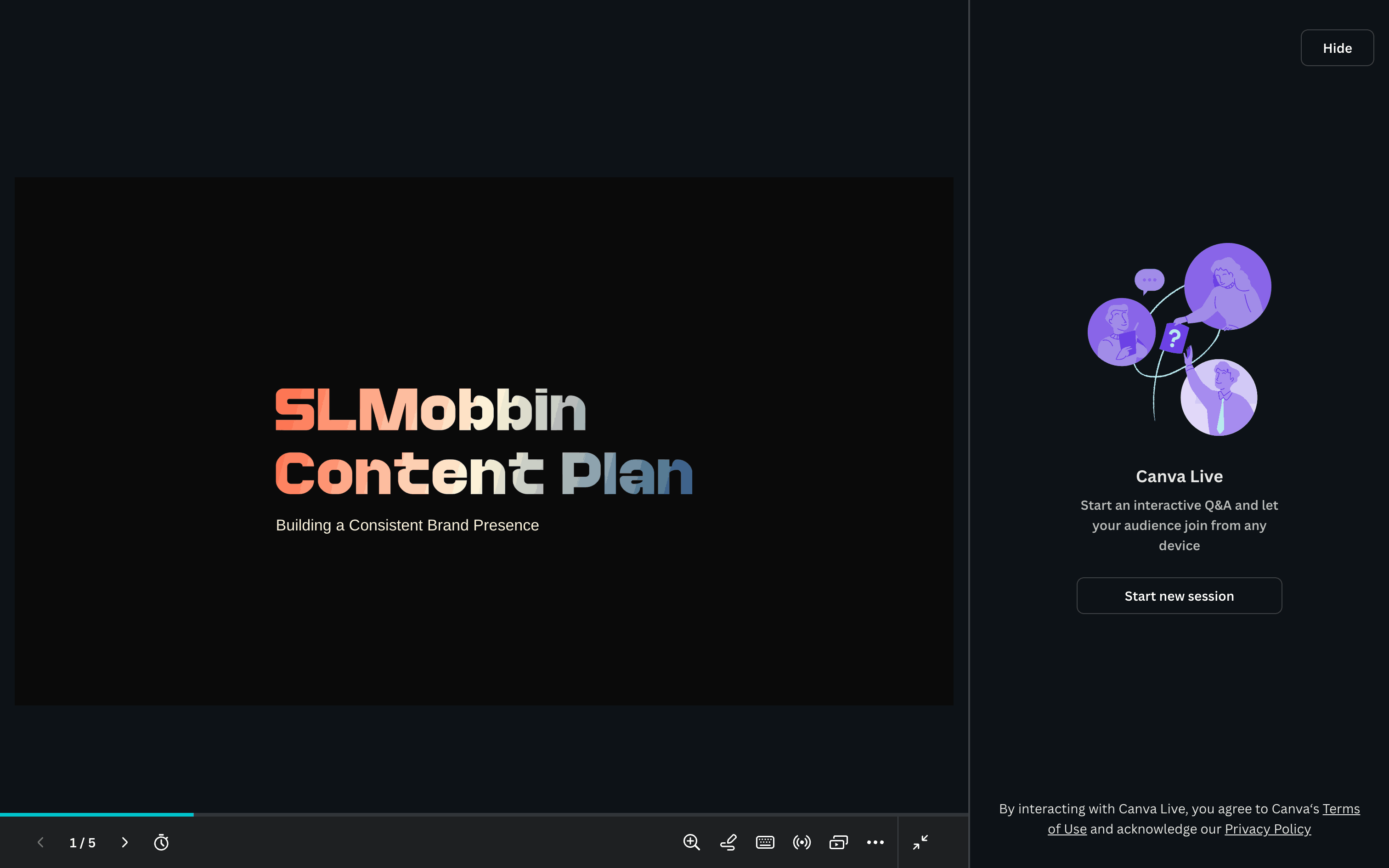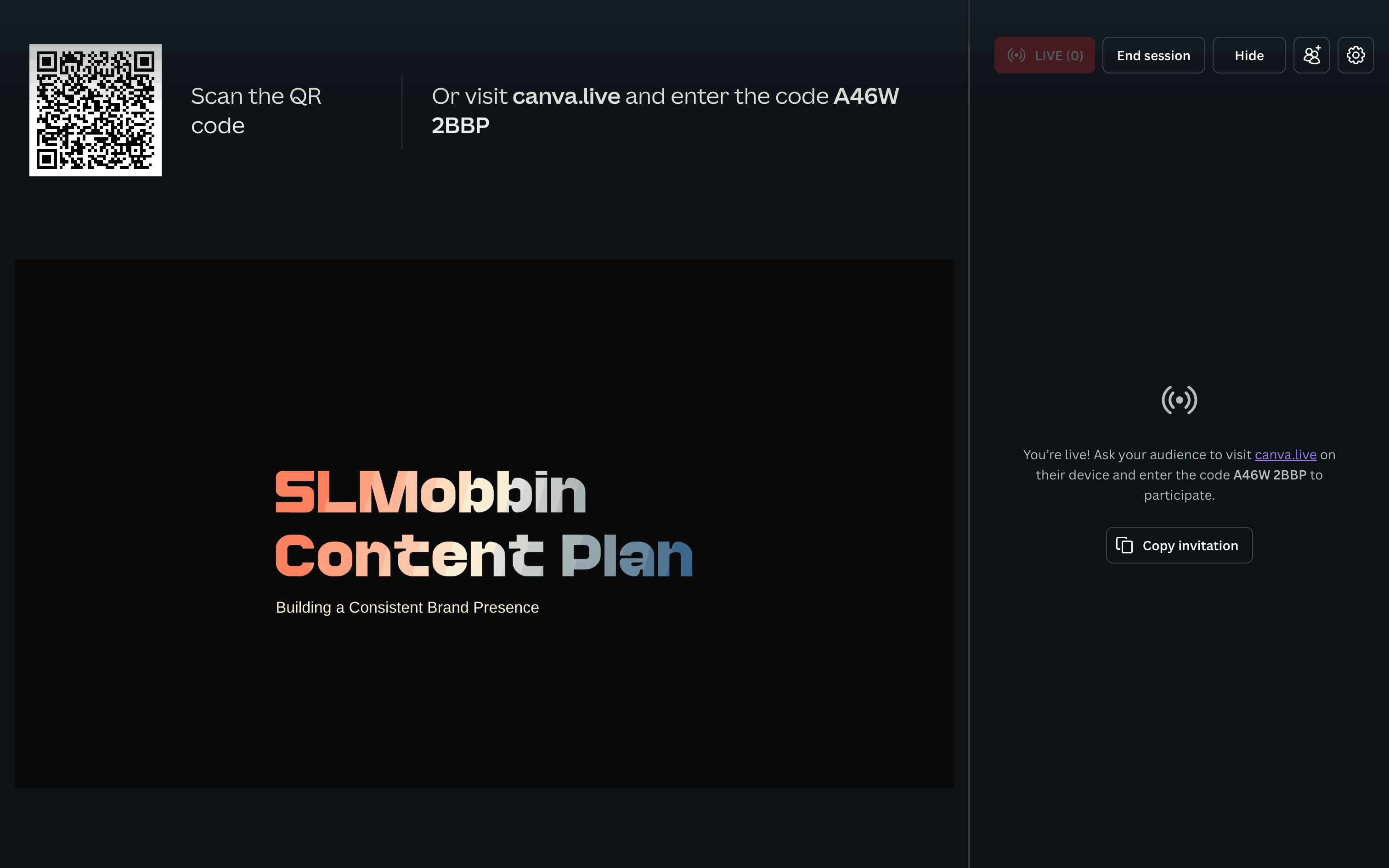 The user flow demonstrates starting a Canva Live session for a presentation. It shows the steps to initiate the session and prepare for audience participation.