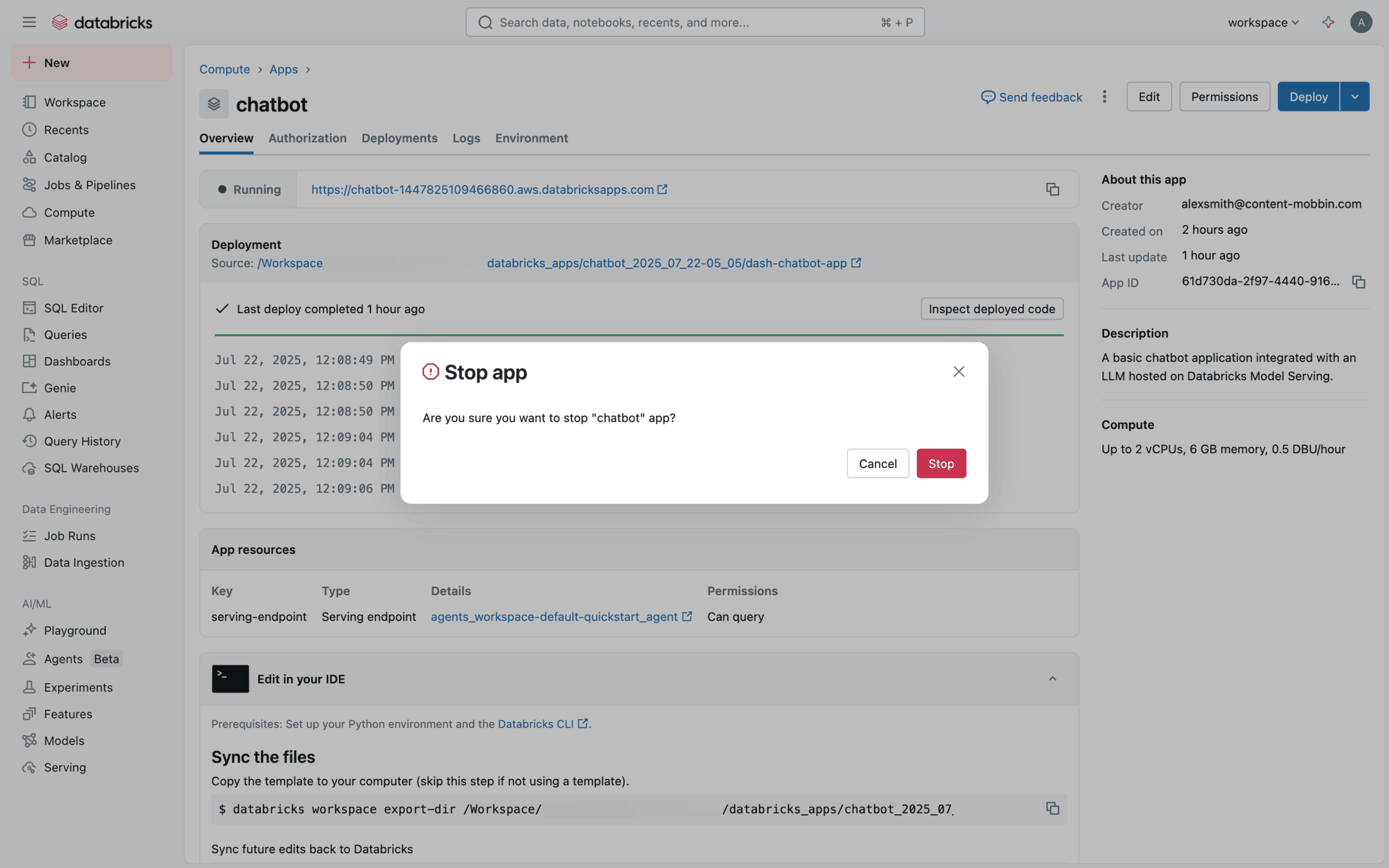 The user flow demonstrates stopping an application, showing the status change from running to stopped. The user confirms the action via a modal dialog.