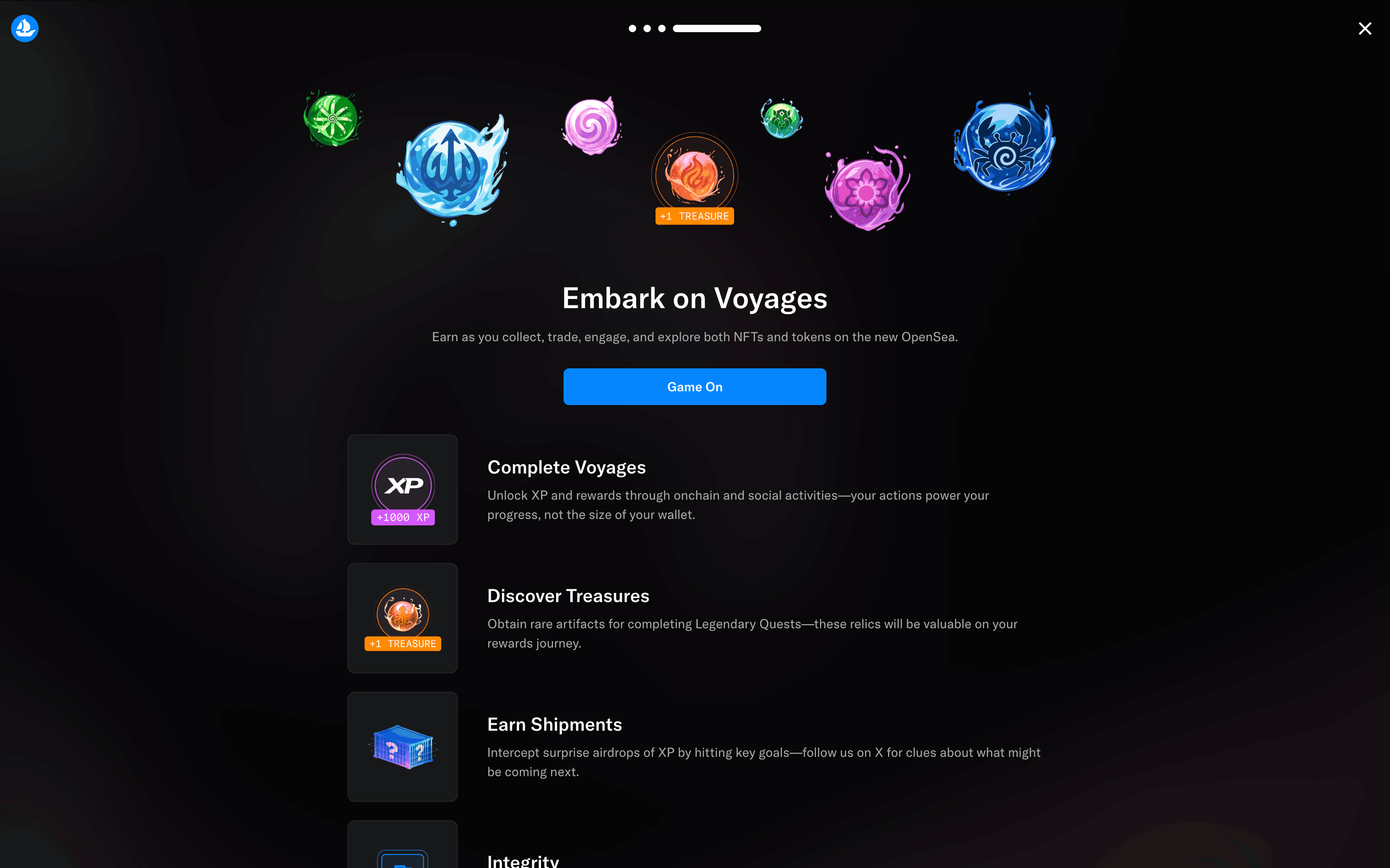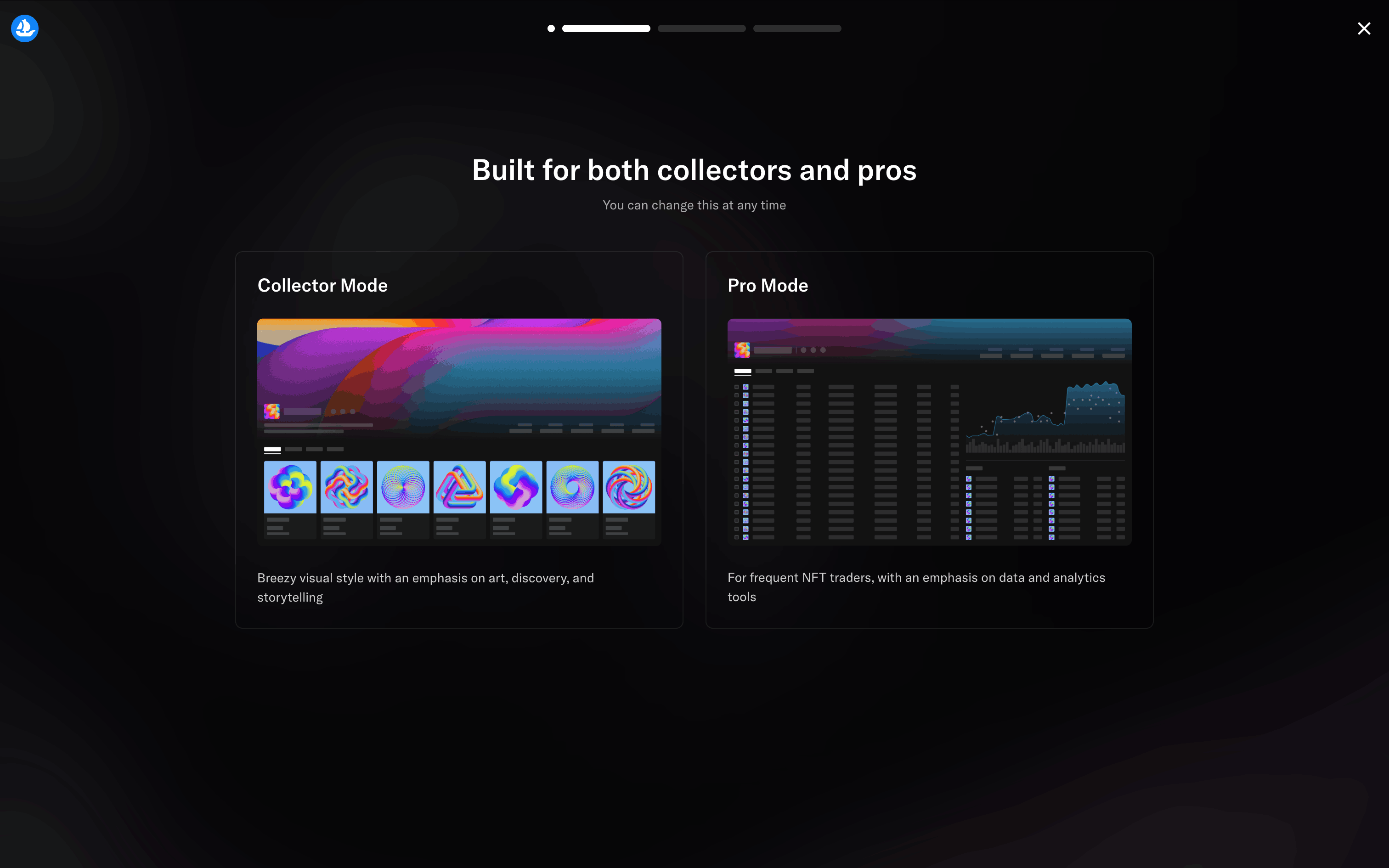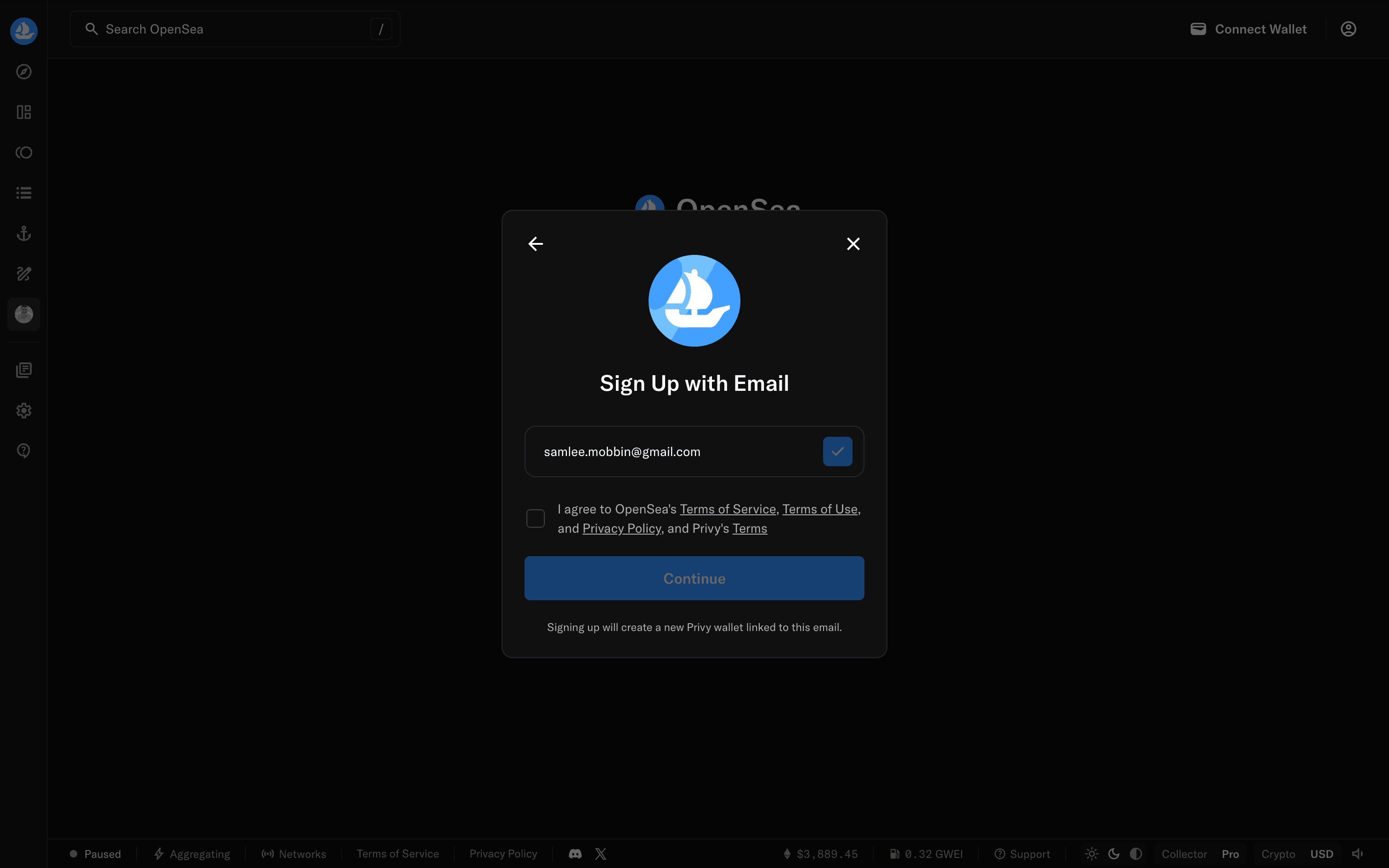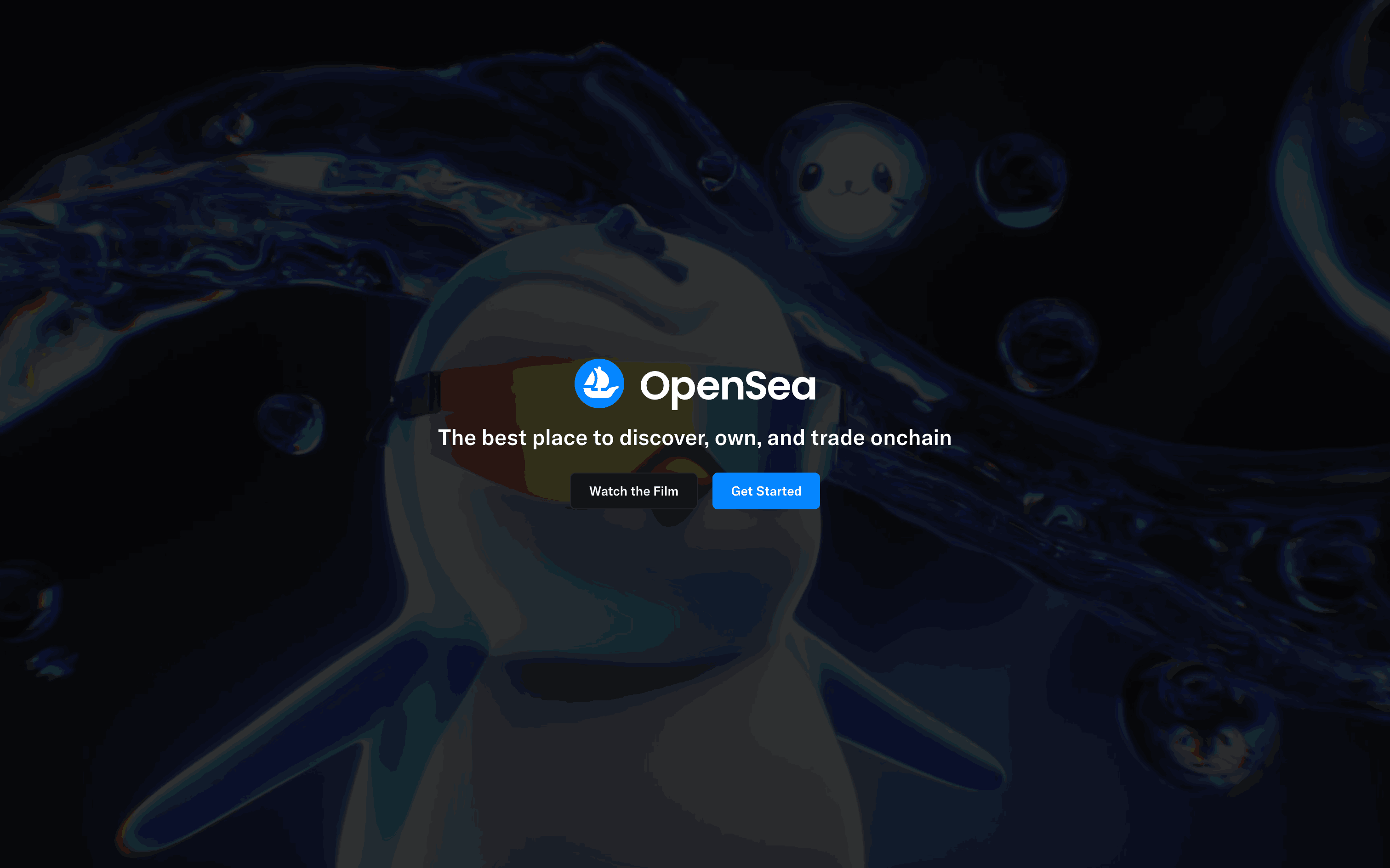 The user goes through onboarding, email sign-up, and is presented with the main marketplace. The flow showcases the initial steps a new user takes on the OpenSea platform.