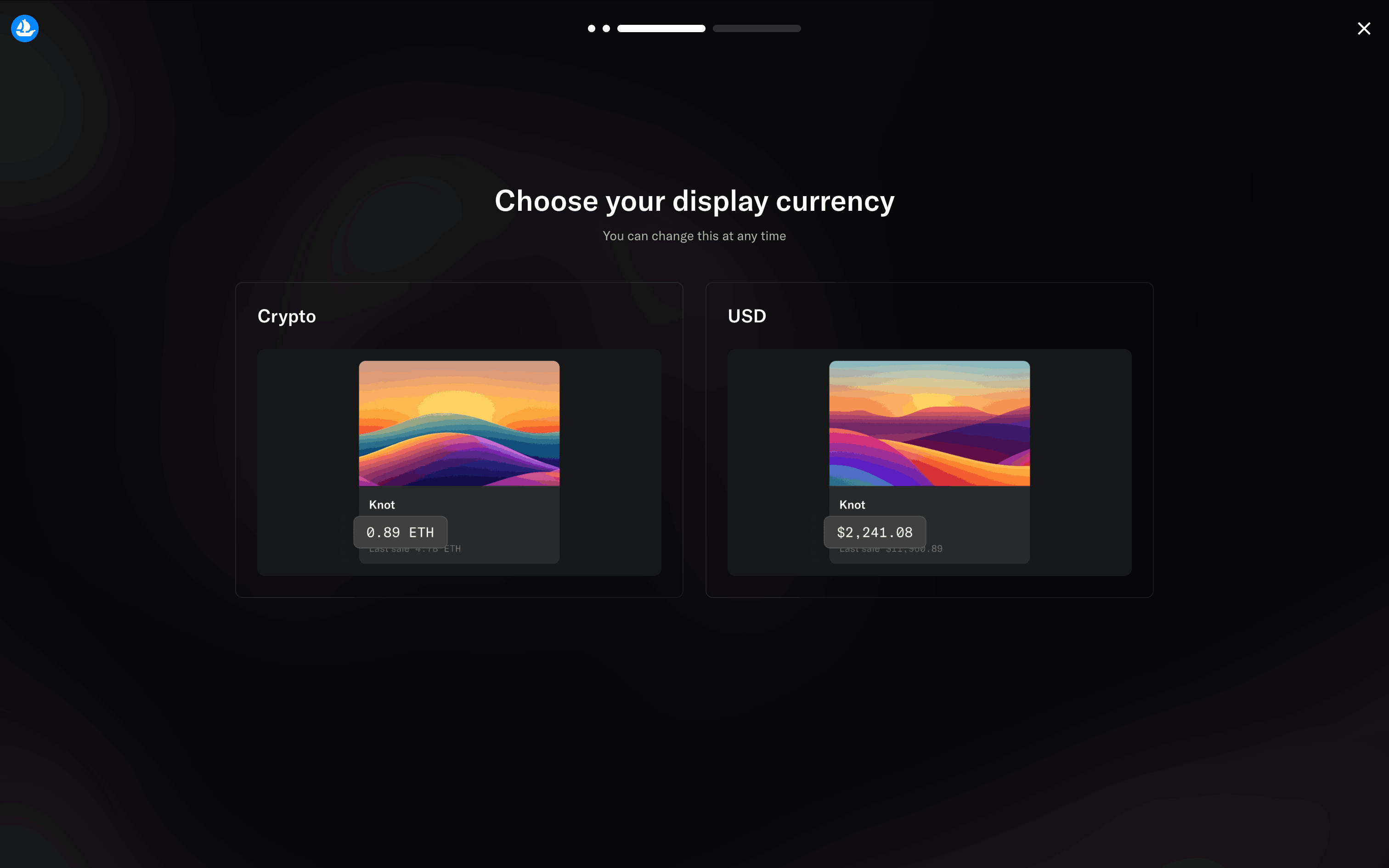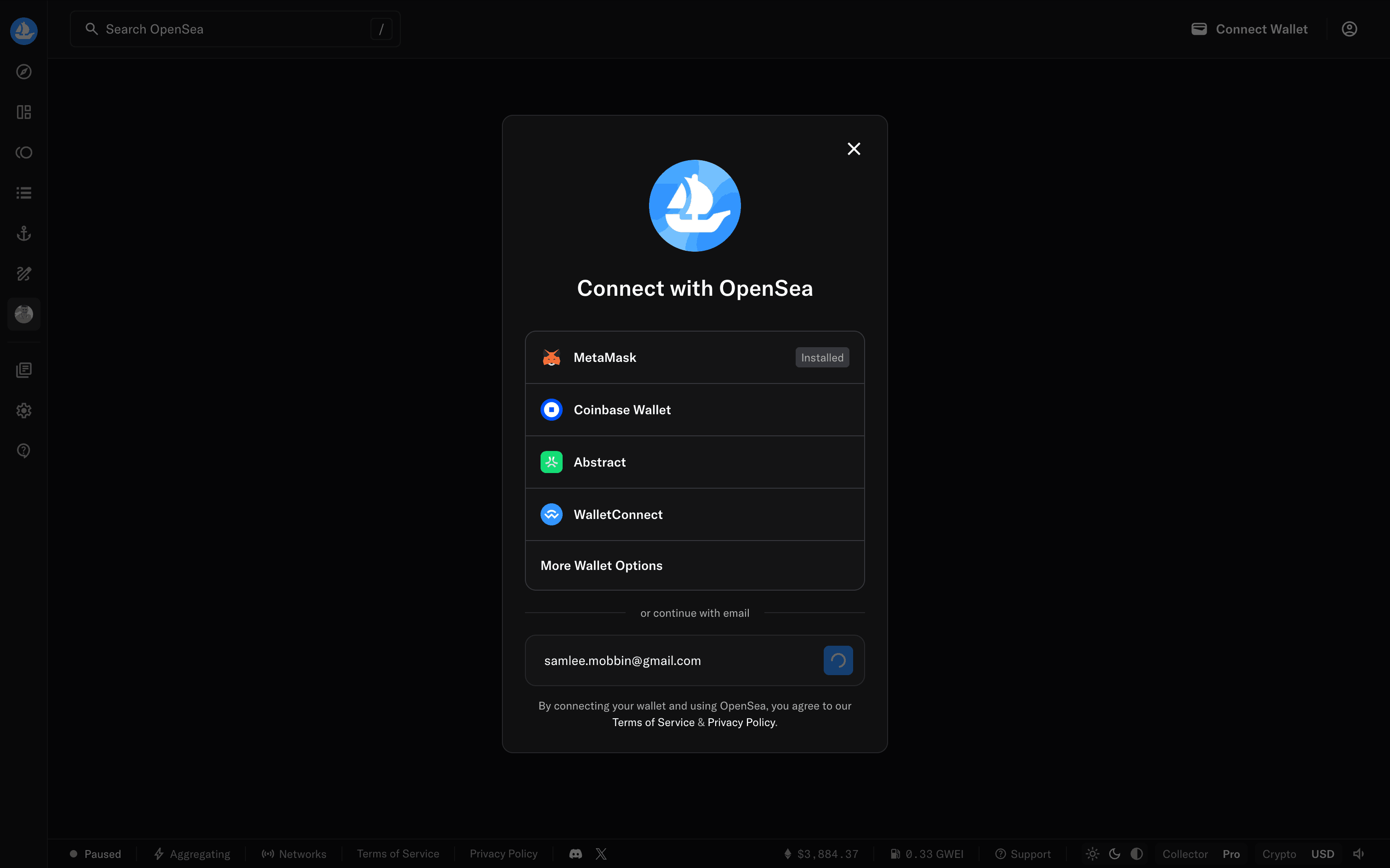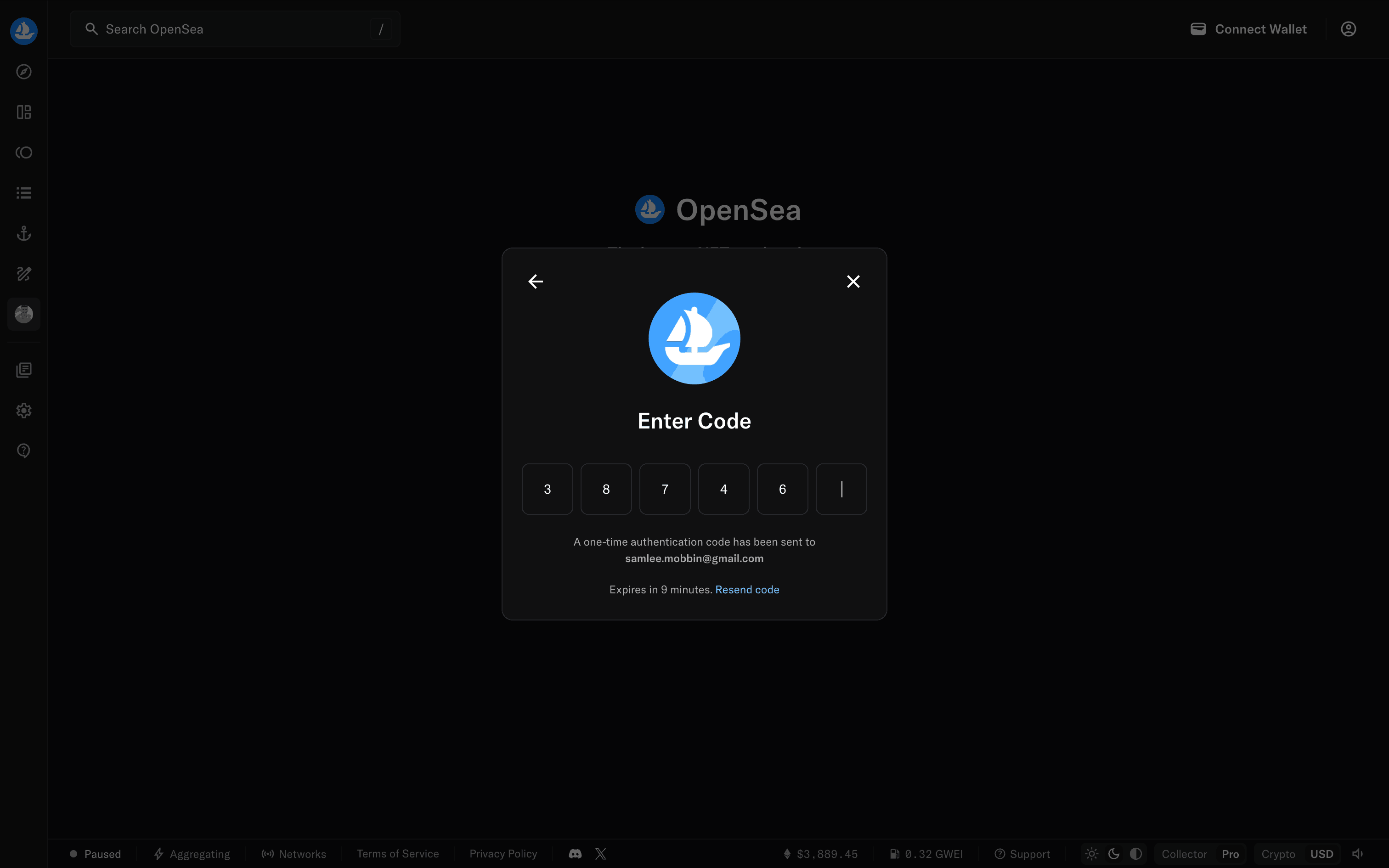 The user goes through onboarding, email sign-up, and is presented with the main marketplace. The flow showcases the initial steps a new user takes on the OpenSea platform.