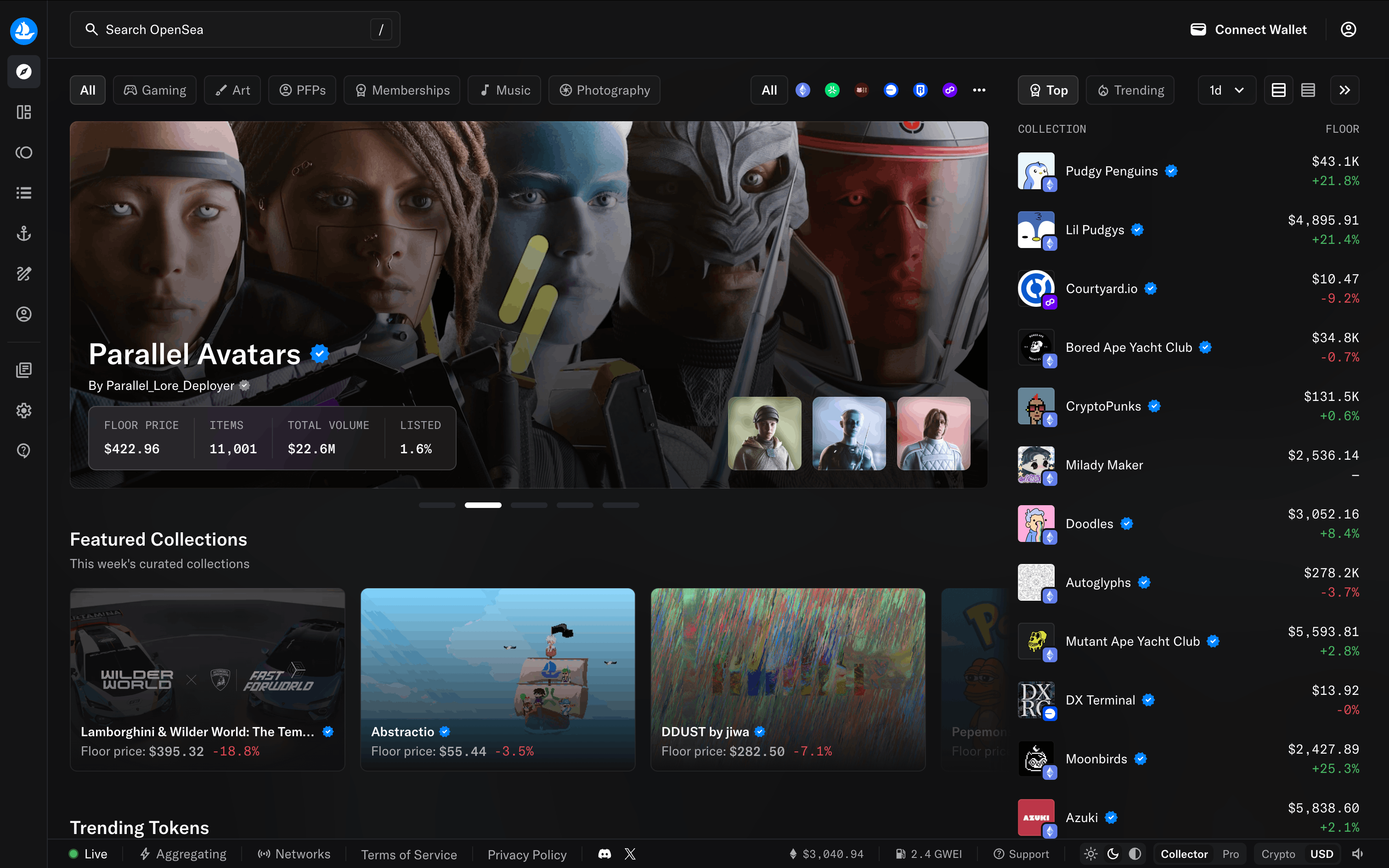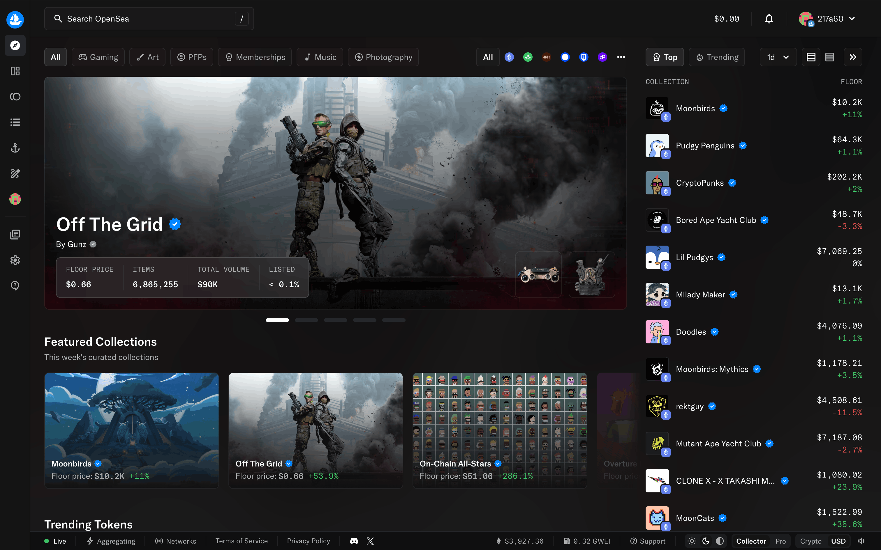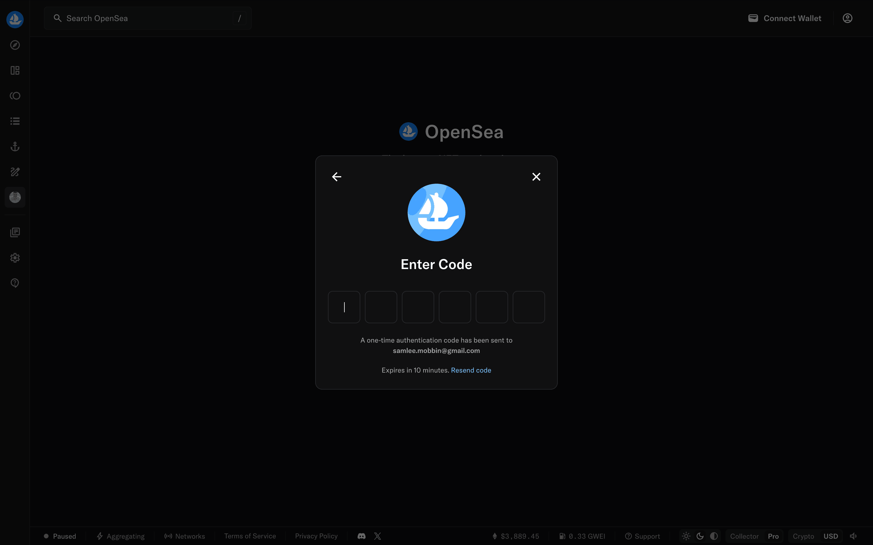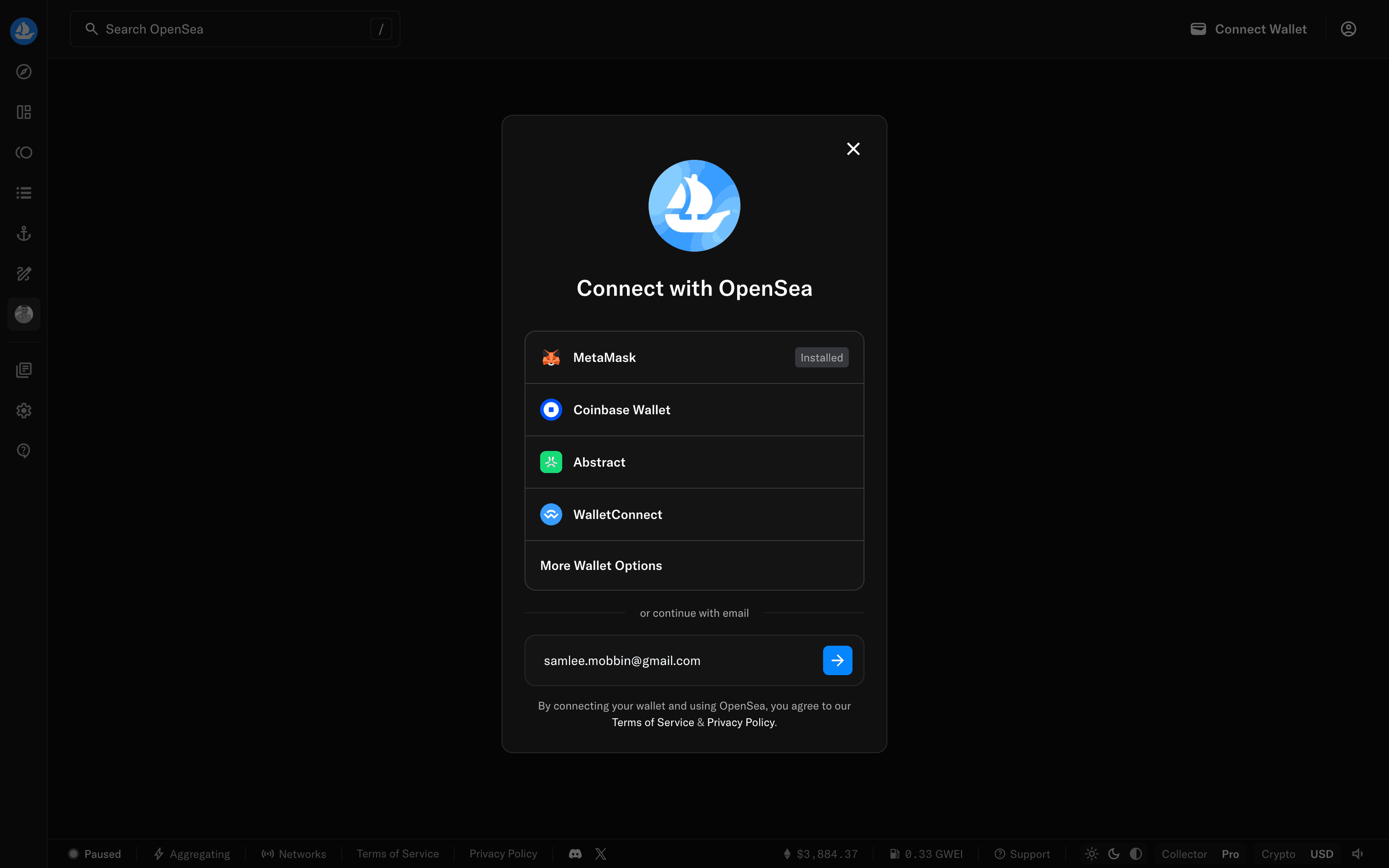 The user goes through onboarding, email sign-up, and is presented with the main marketplace. The flow showcases the initial steps a new user takes on the OpenSea platform.