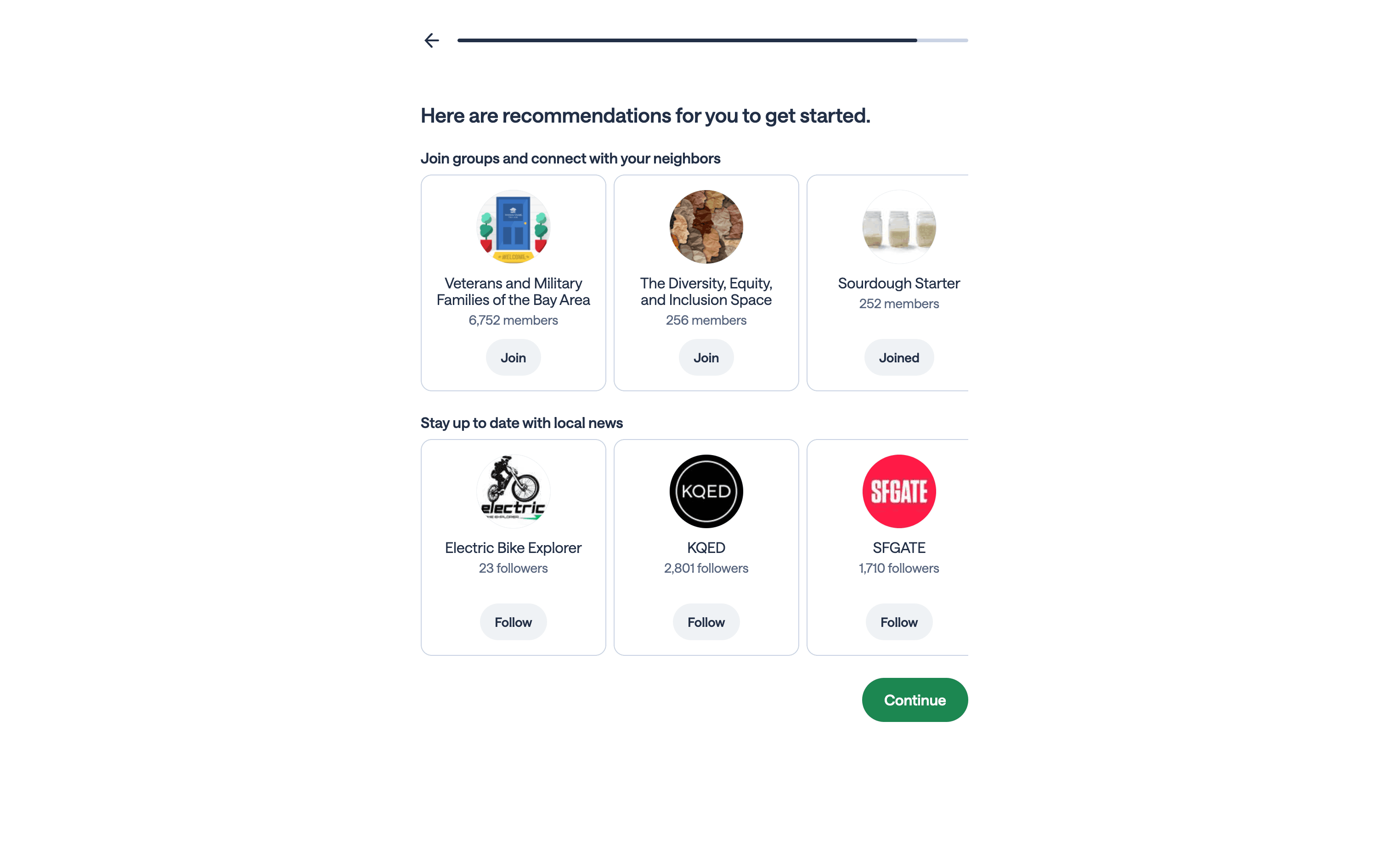 The user flow guides a new user through the signup process, account verification, and initial setup questions before landing in the main inbox view. The user is prompted to complete the setup guide.