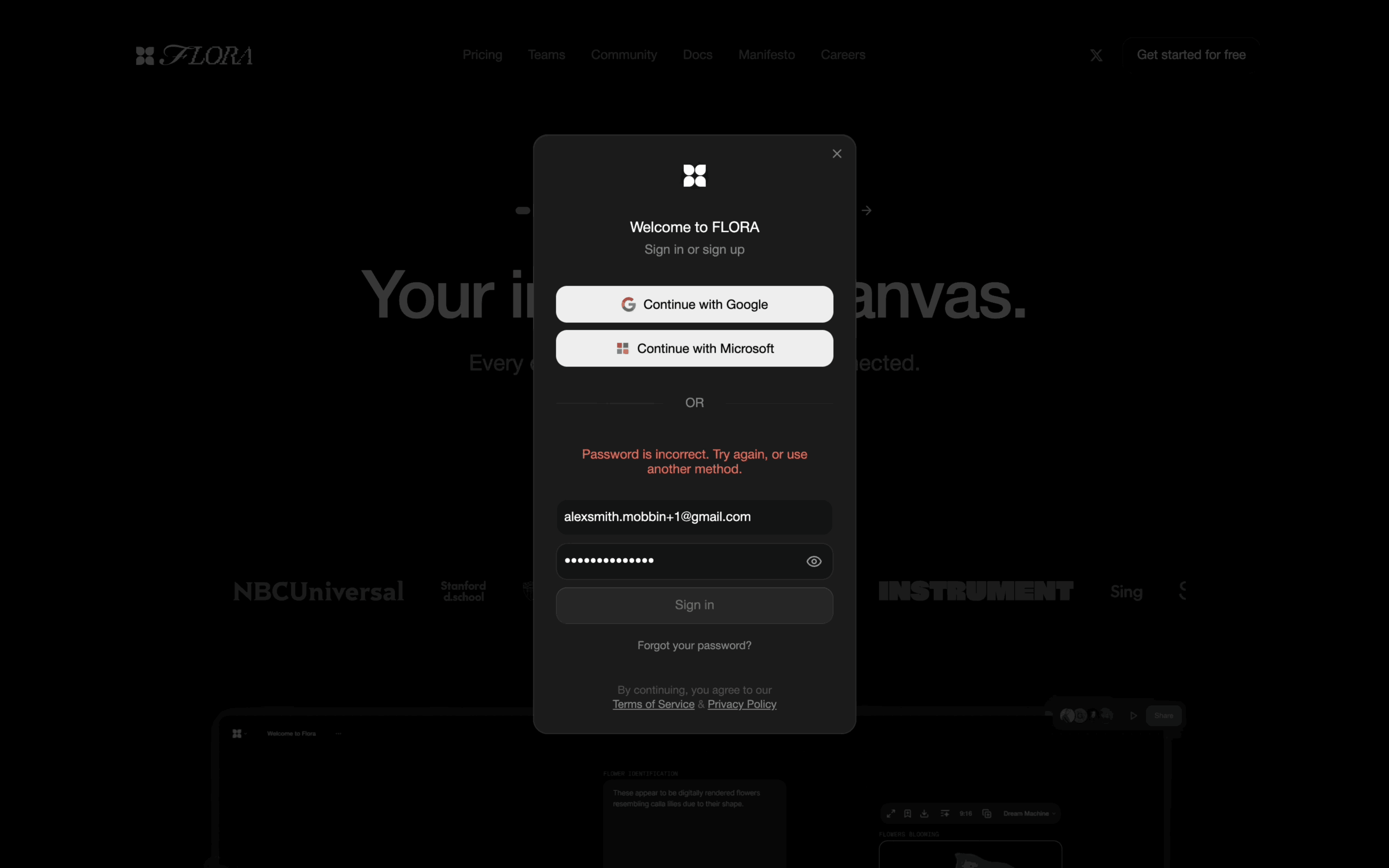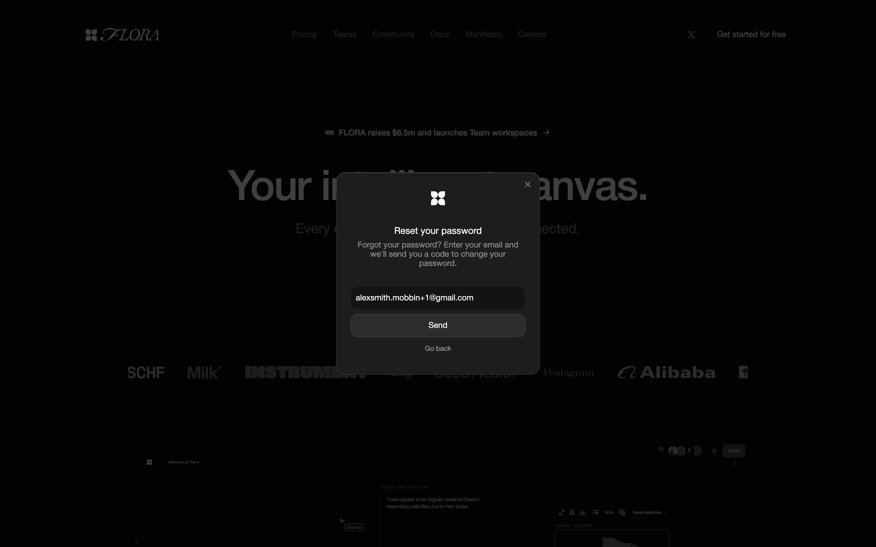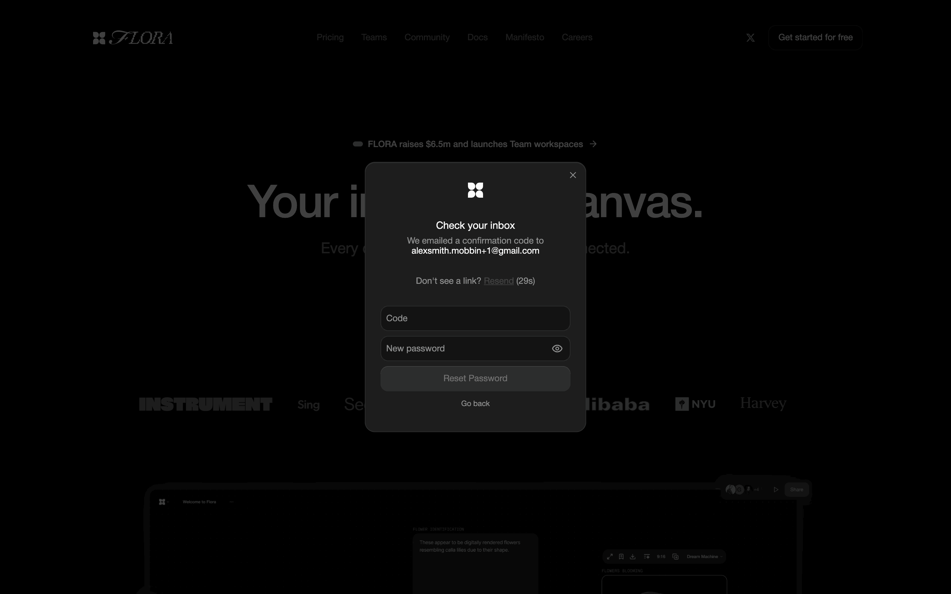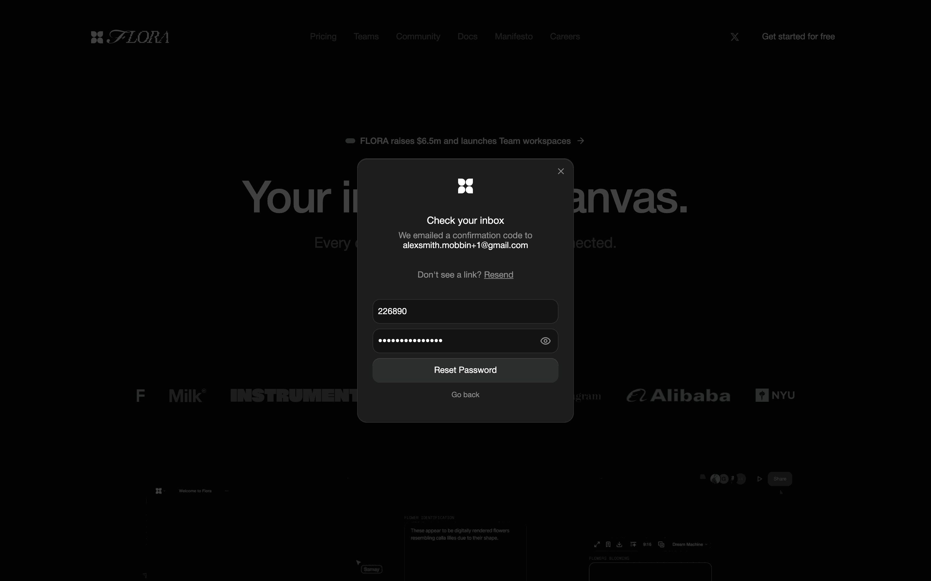 The user resets their password after failing to log in, and is then redirected to their workspace. The flow involves email verification and setting a new password.
