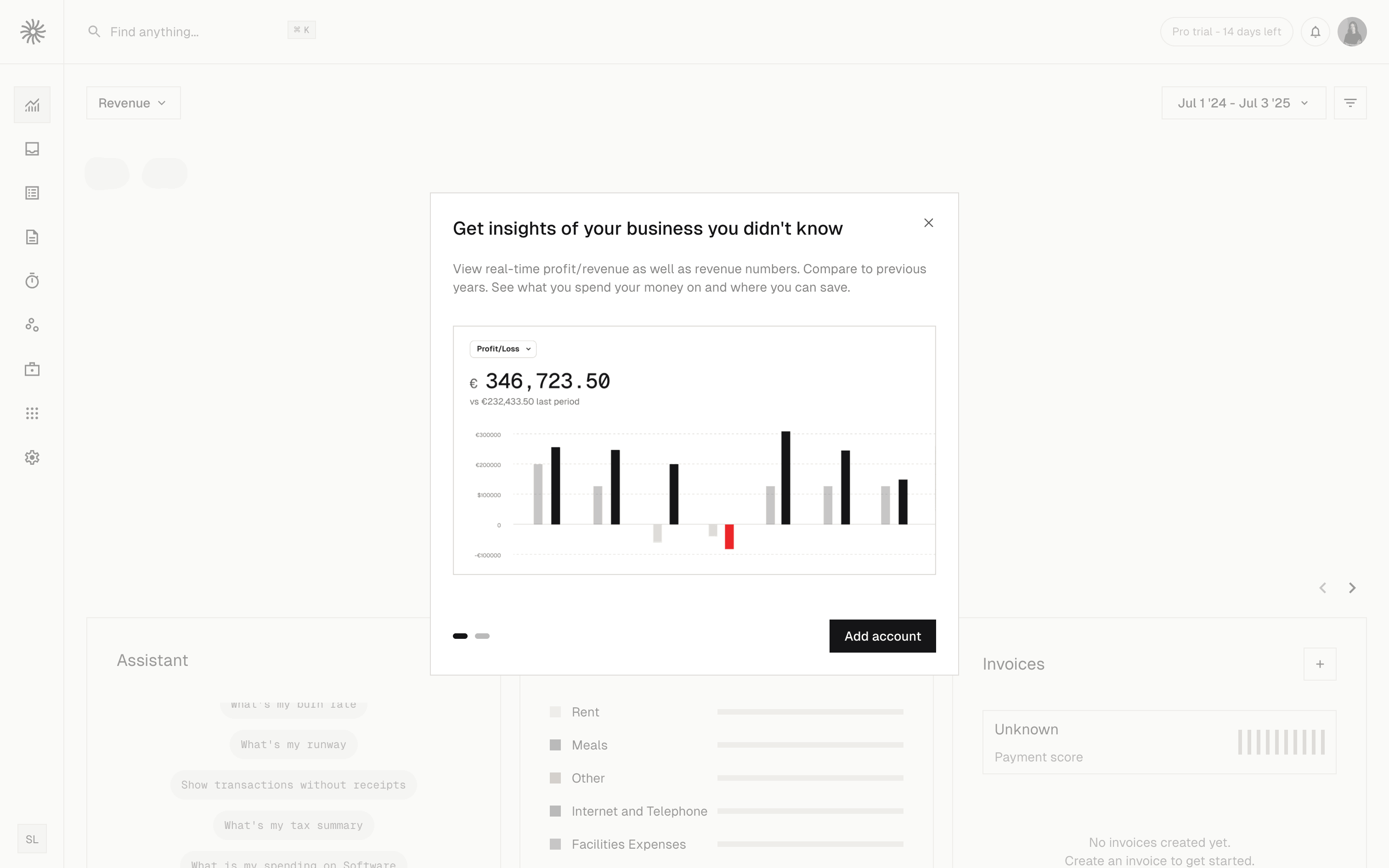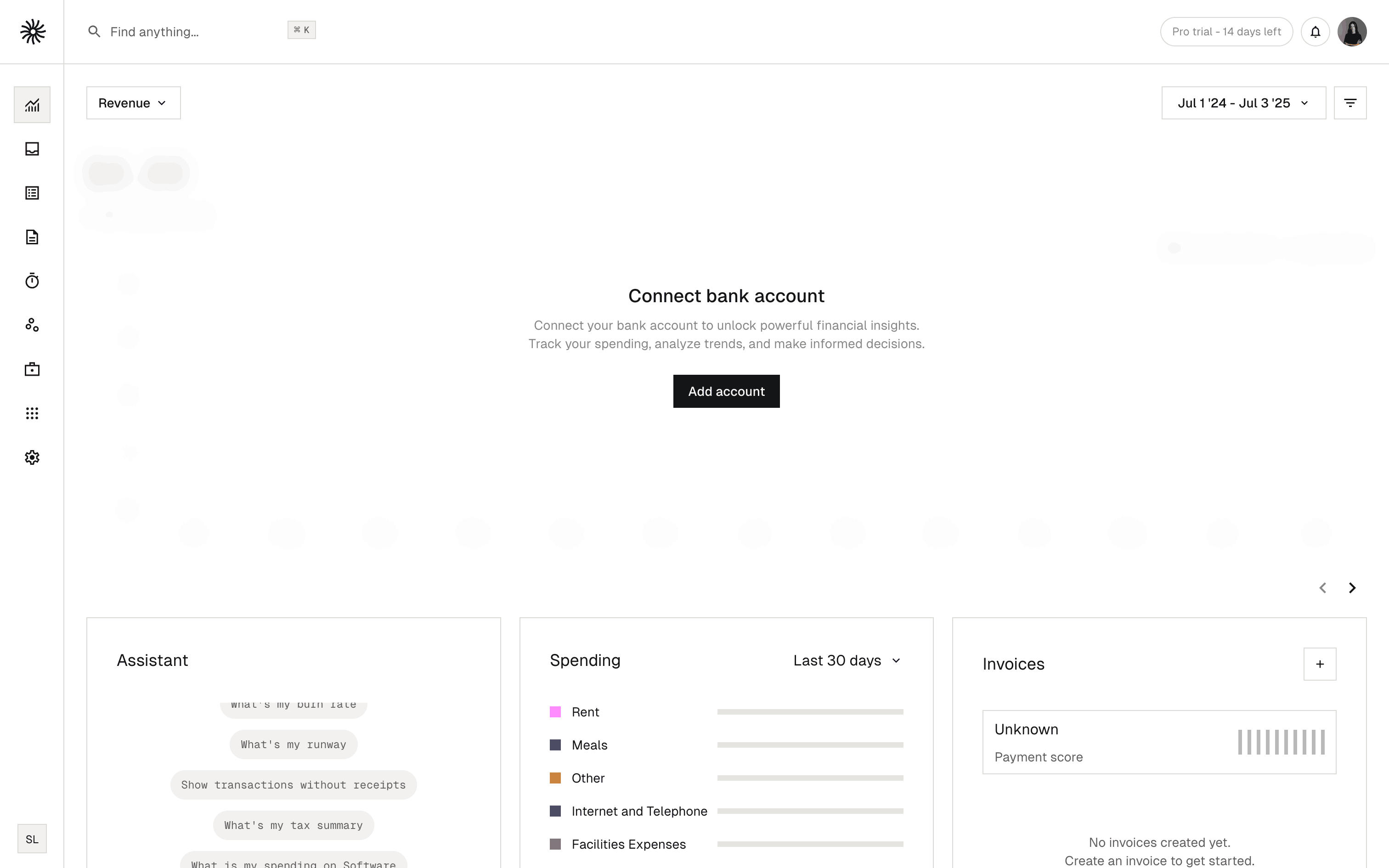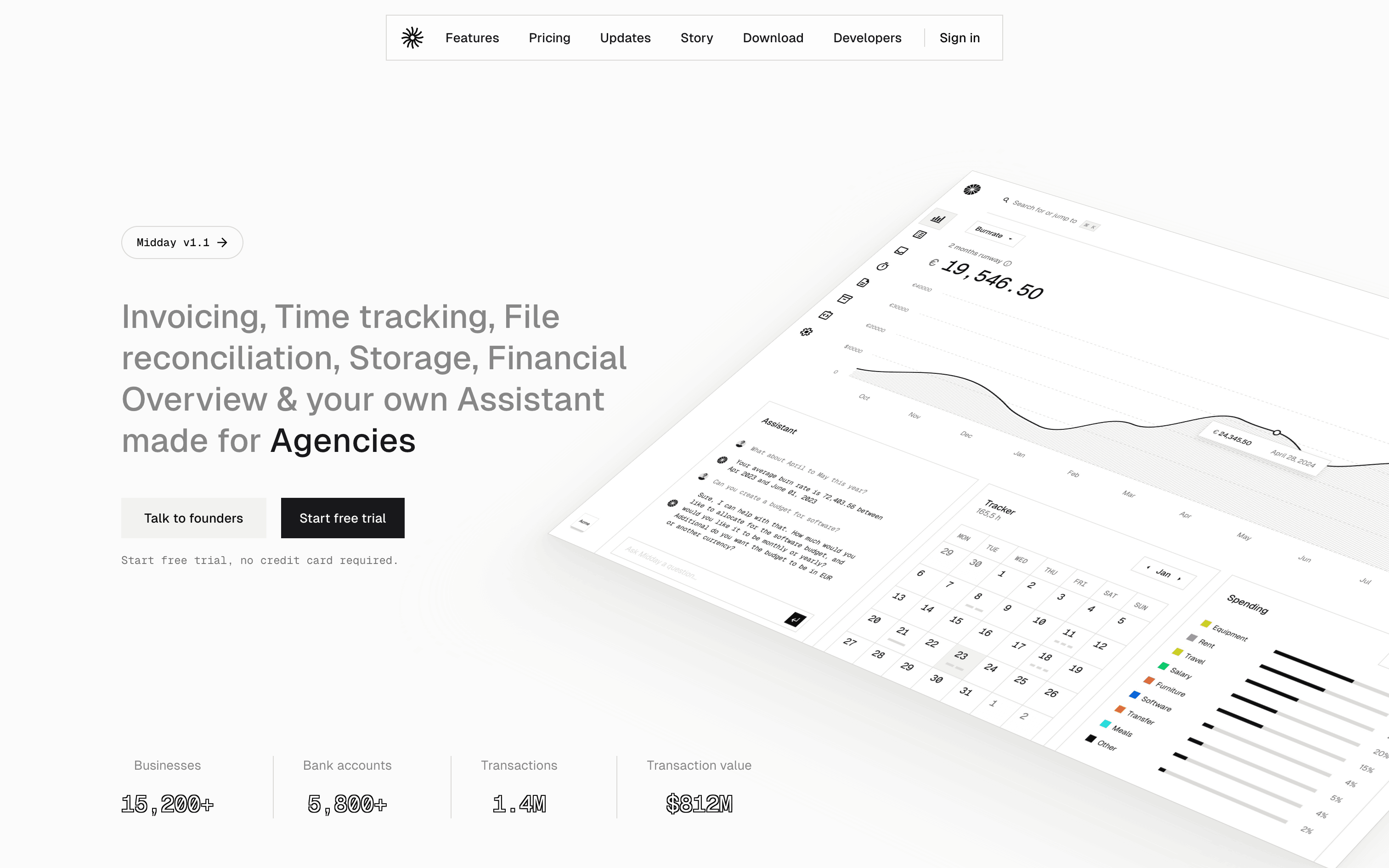 The user flow showcases the onboarding process, from landing page to dashboard. It includes login, account setup, team creation, and a prompt to connect a bank account.
