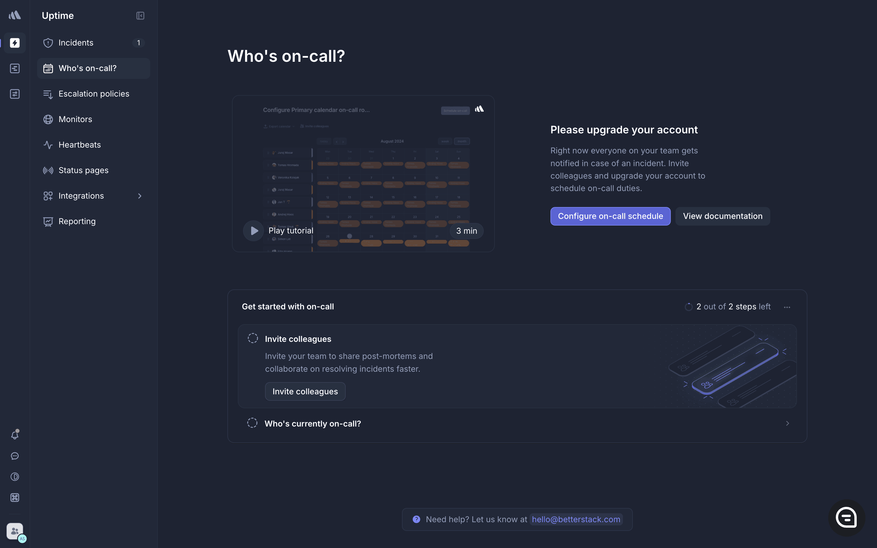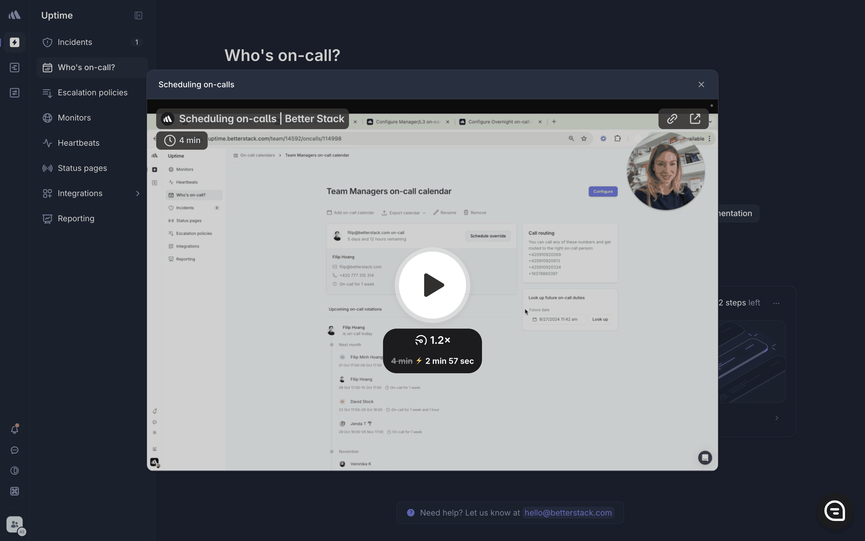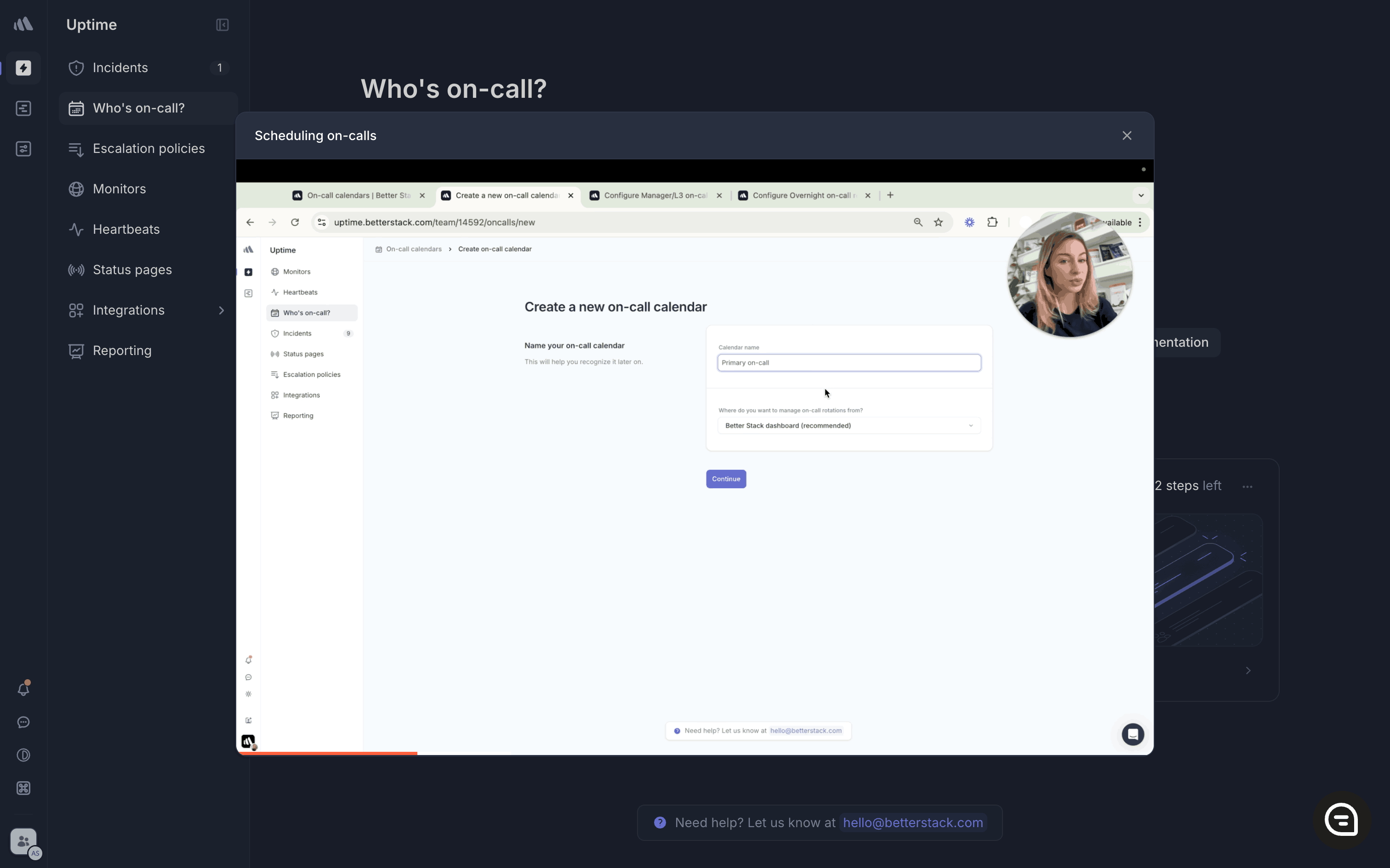 The user watches a tutorial video about on-call scheduling and is then guided to create a new on-call calendar. The flow provides a guided experience.