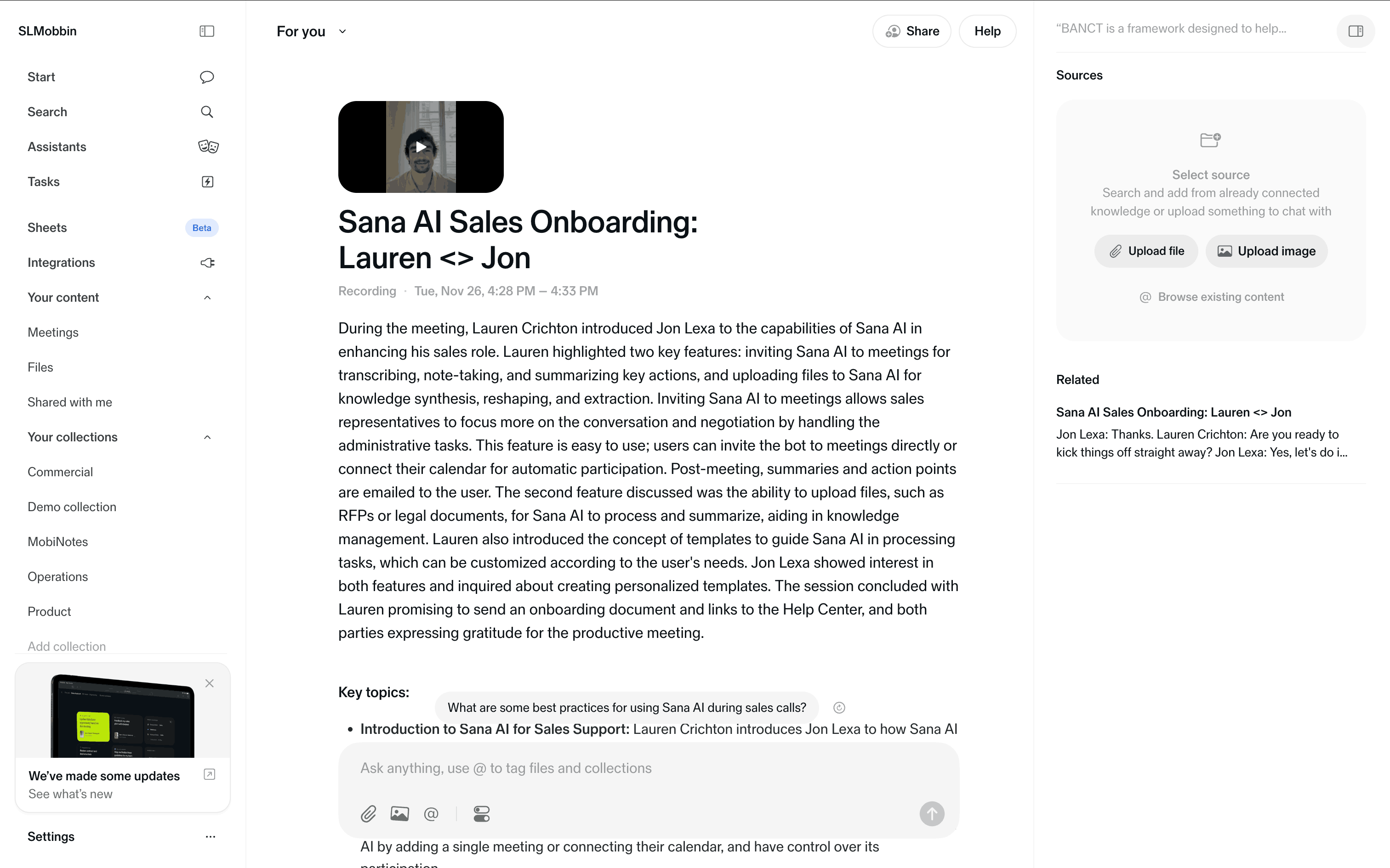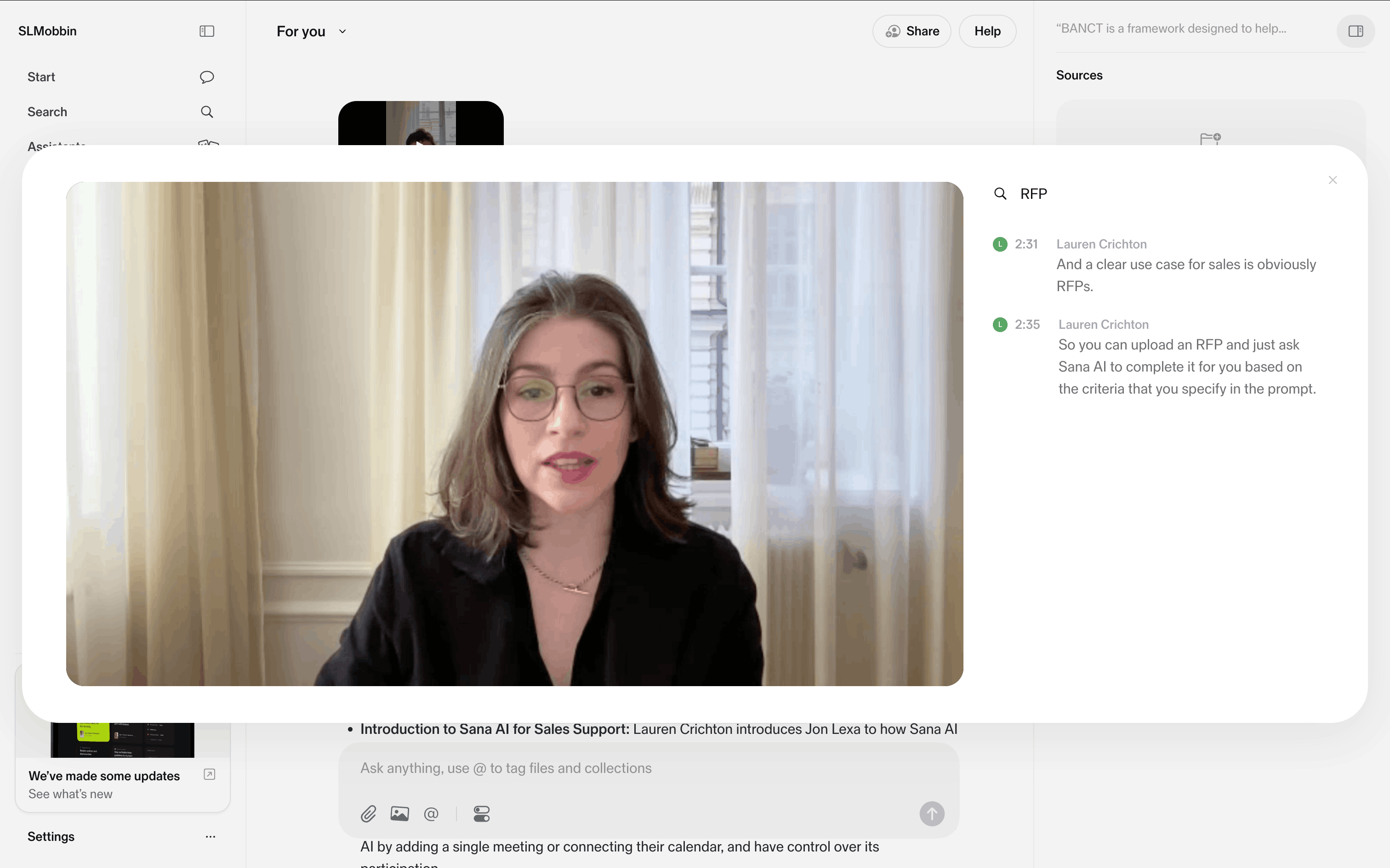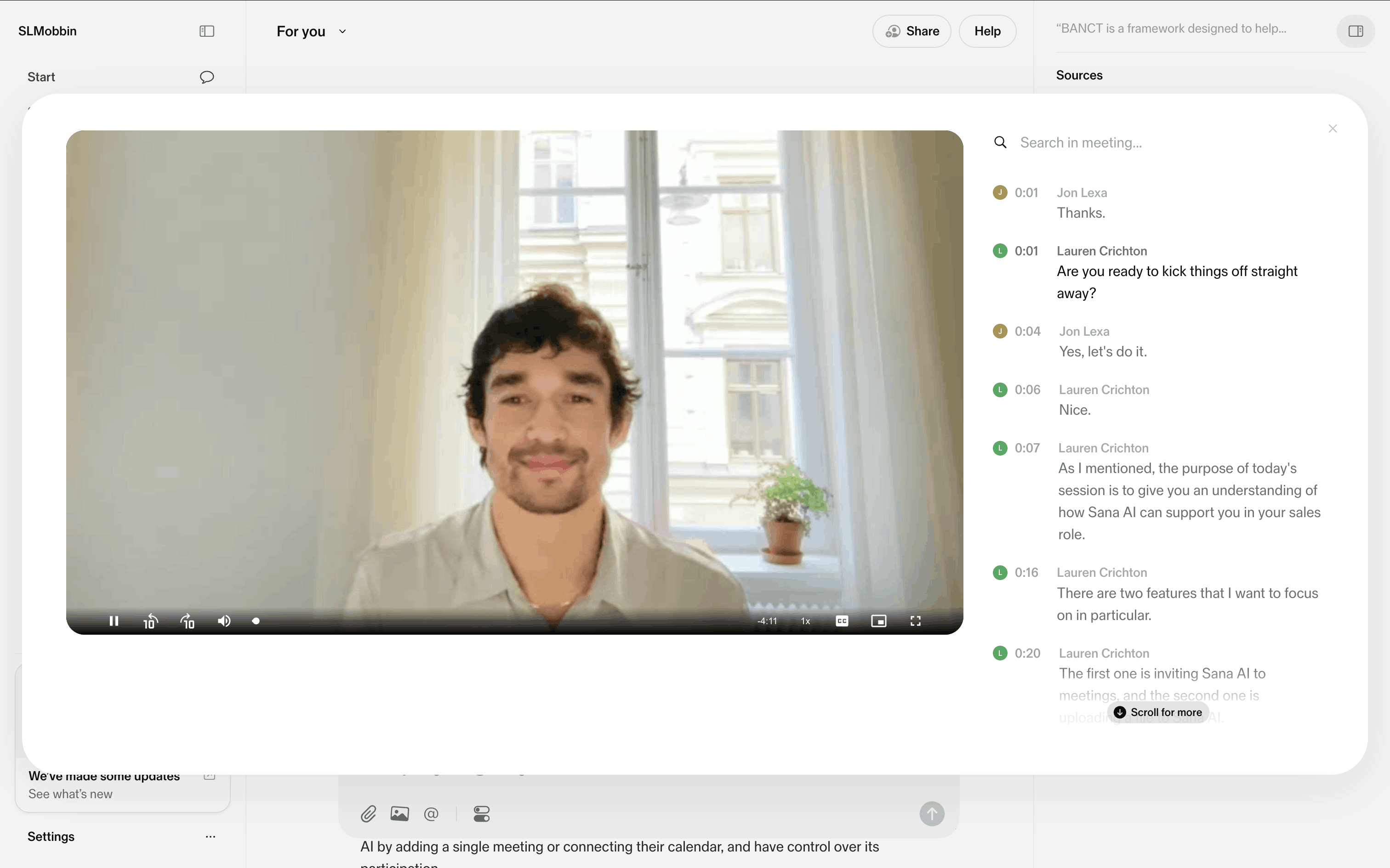 The user views a video from a document, then watches it in a modal with a chat log. The flow showcases video playback and associated conversation.