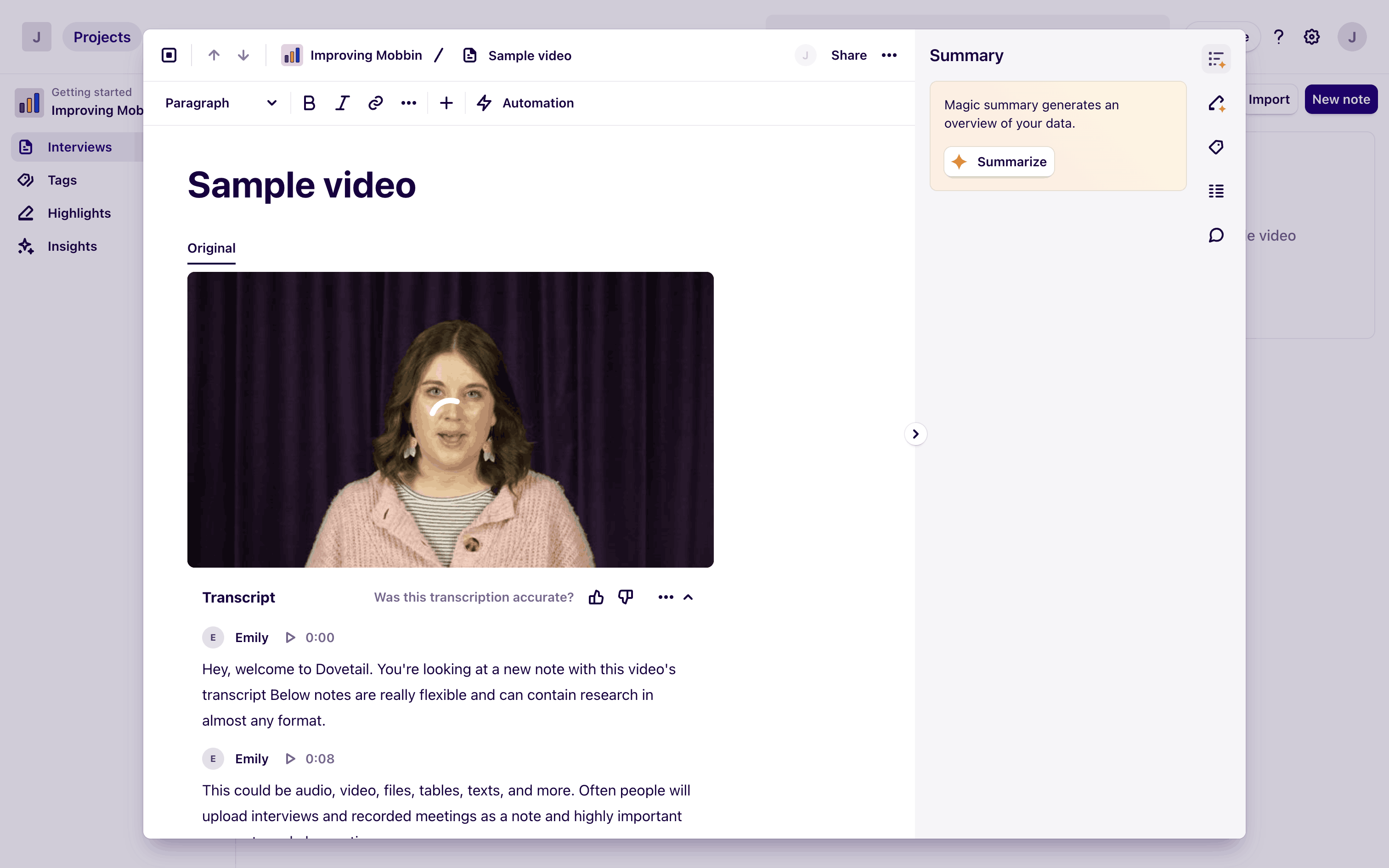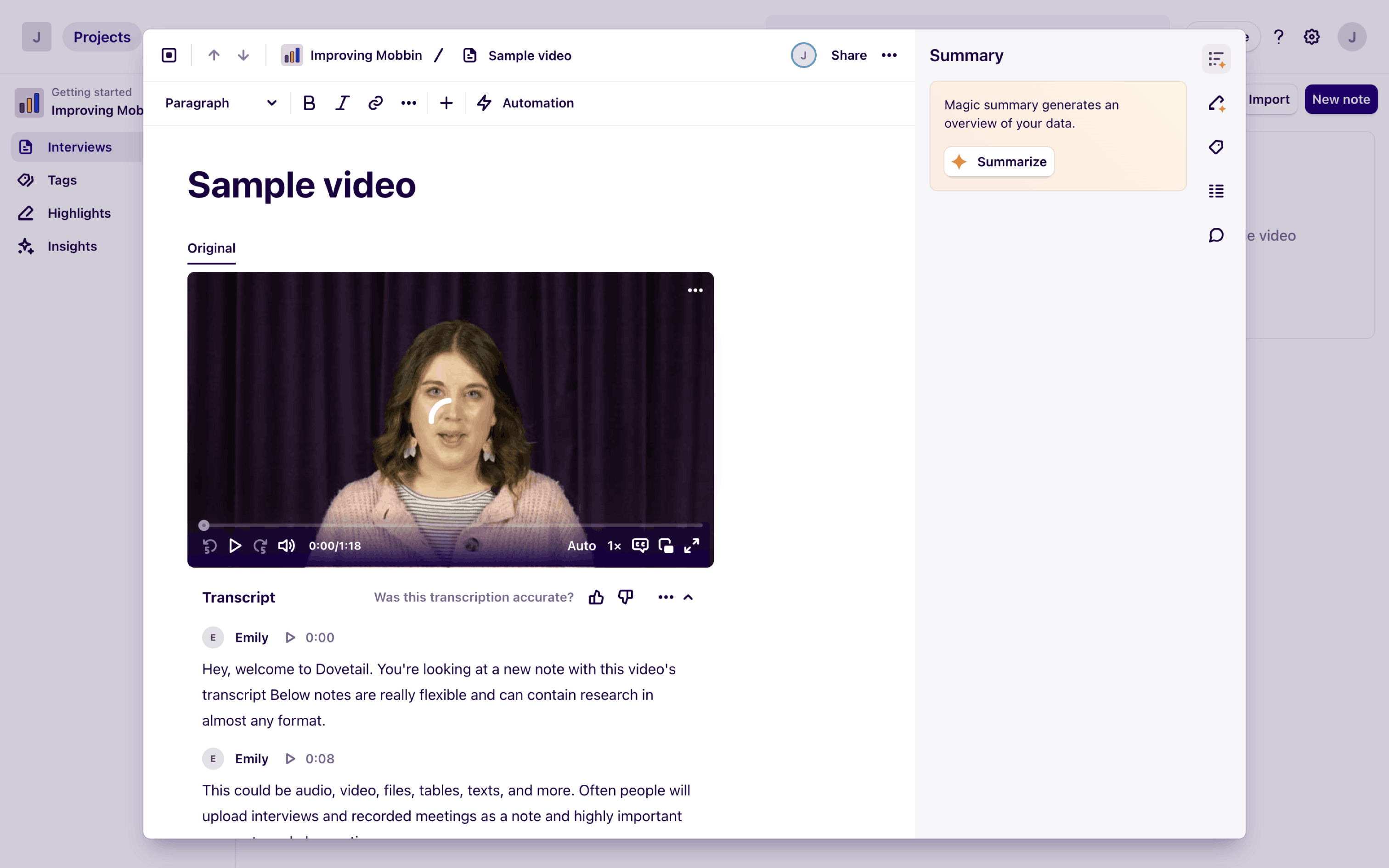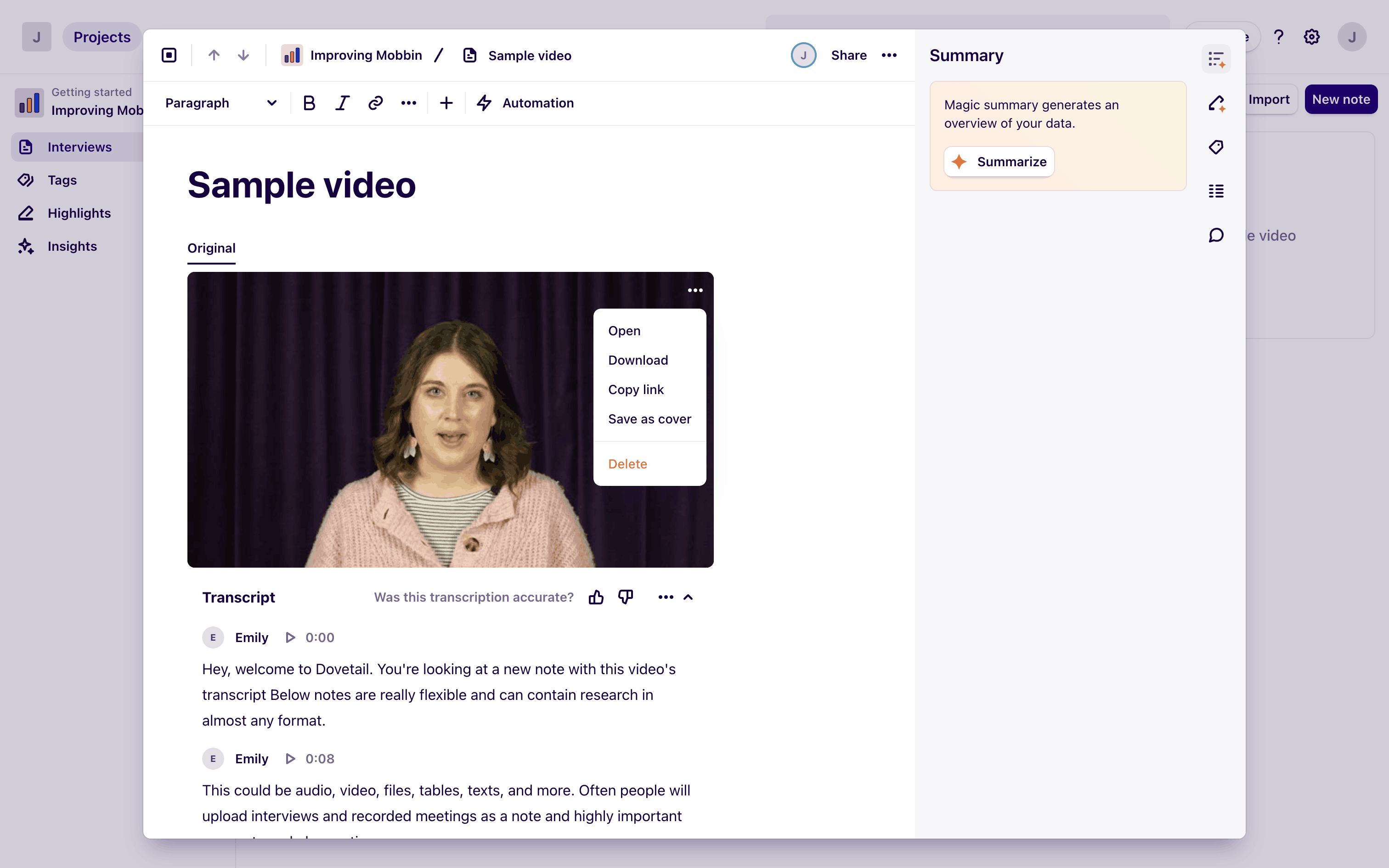 The user views a video from a document, then watches it in a modal with a chat log. The flow showcases video playback and associated conversation.