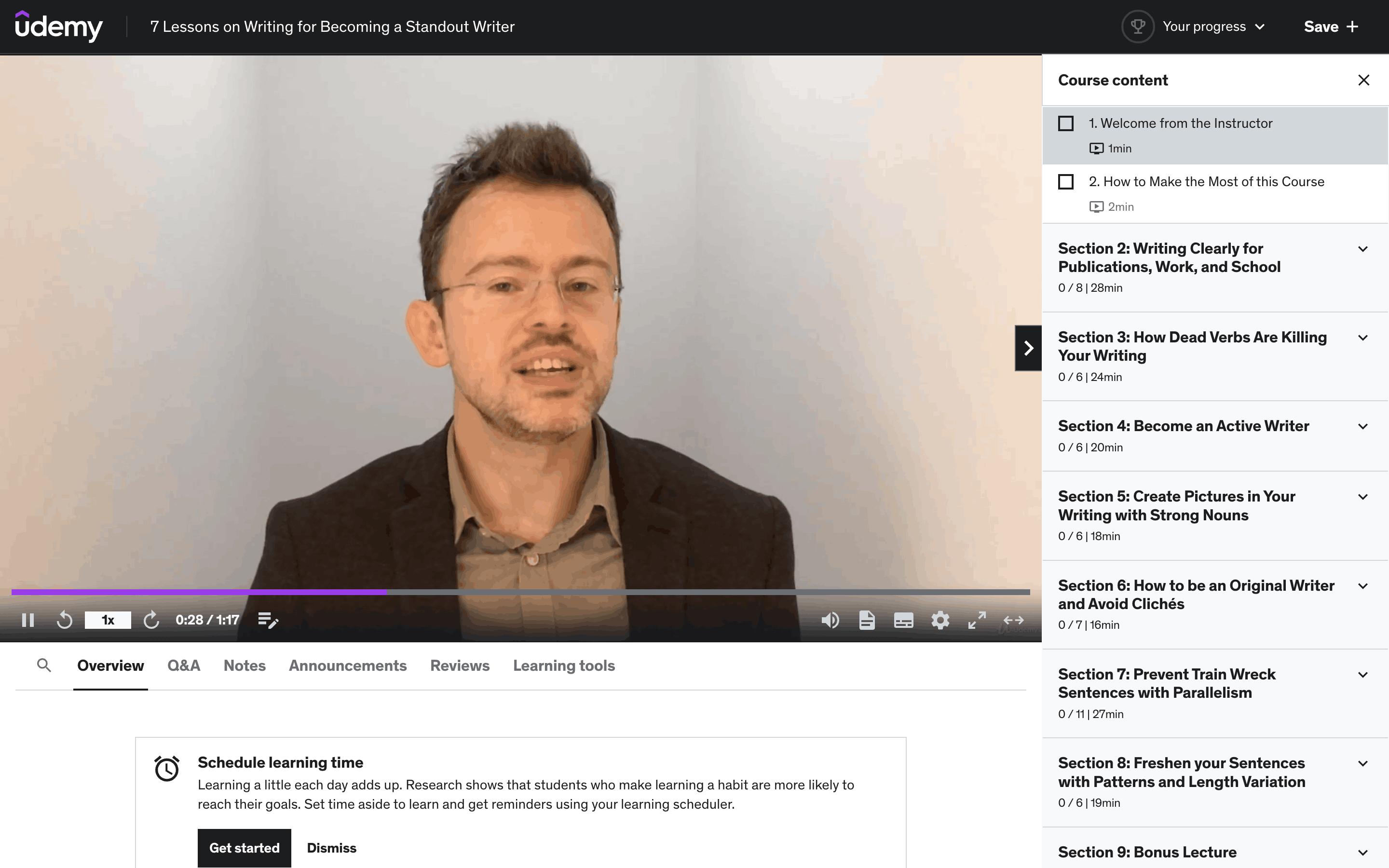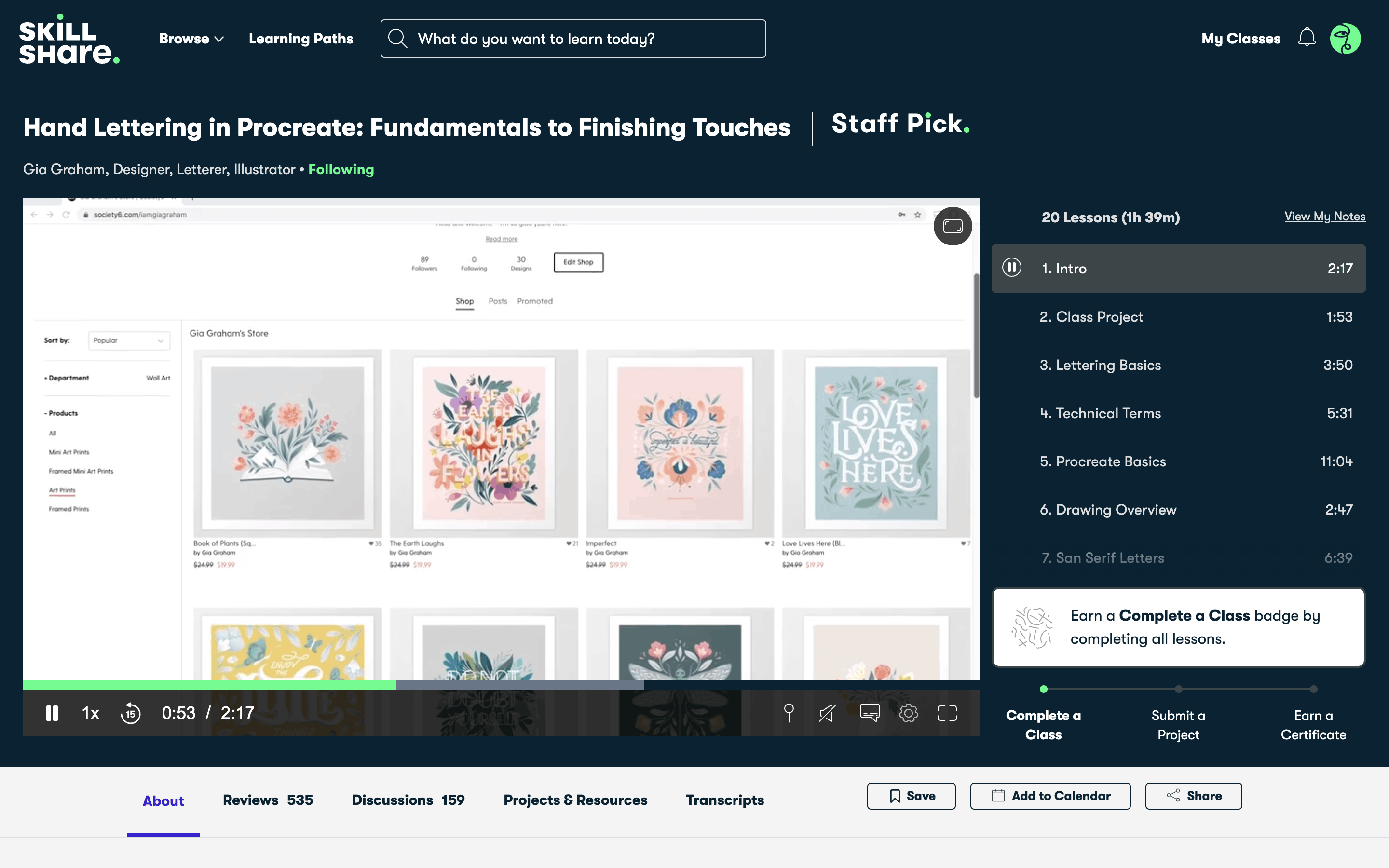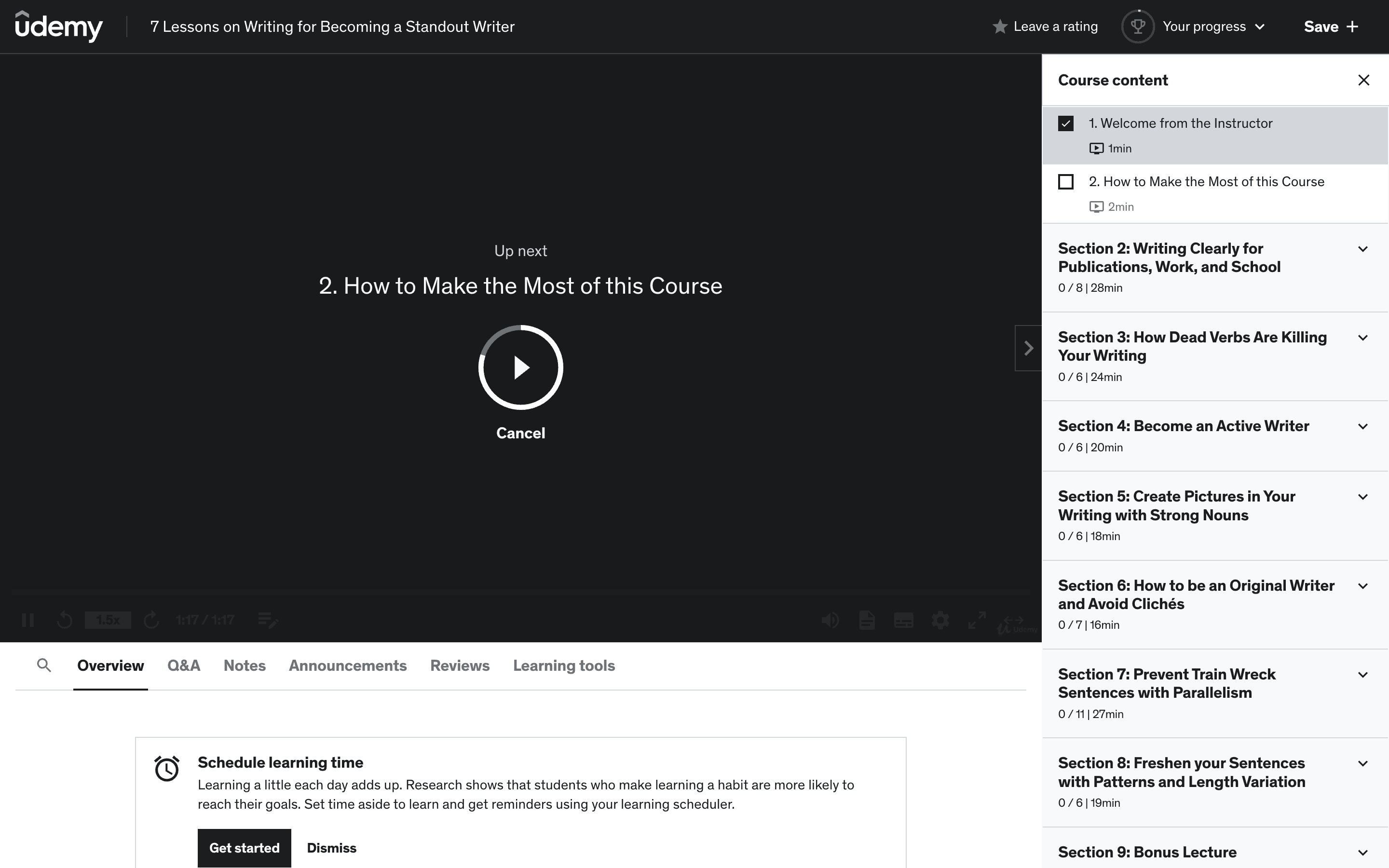 The user watches a lesson, sees the 'up next' screen, and then starts the next lesson. The course content updates to reflect progress.