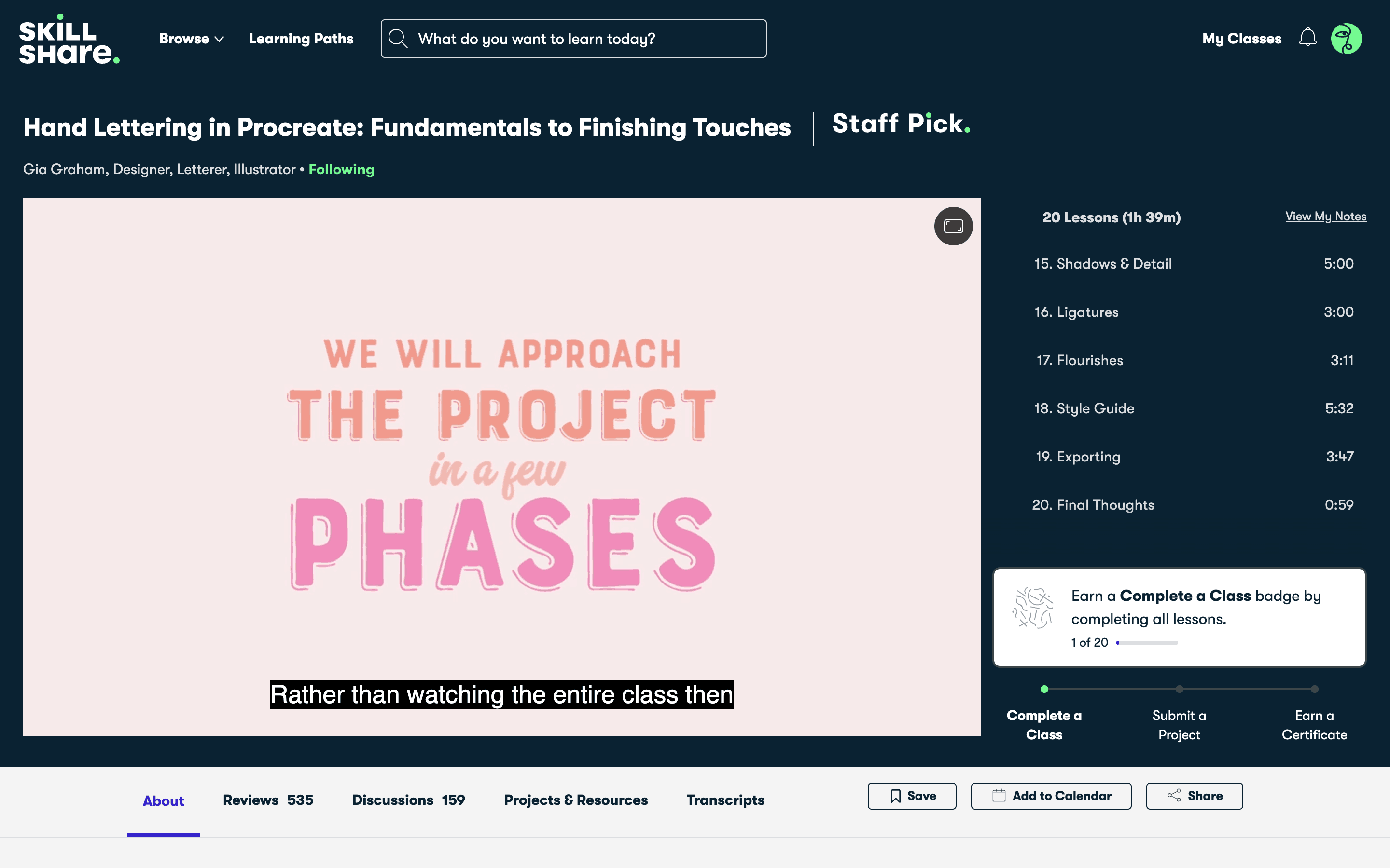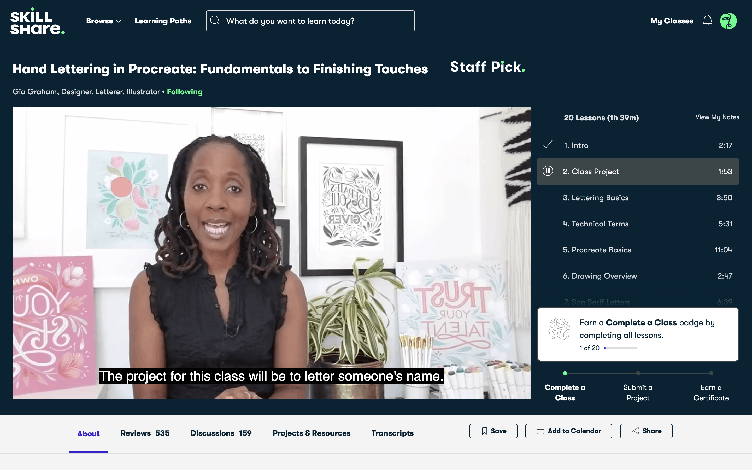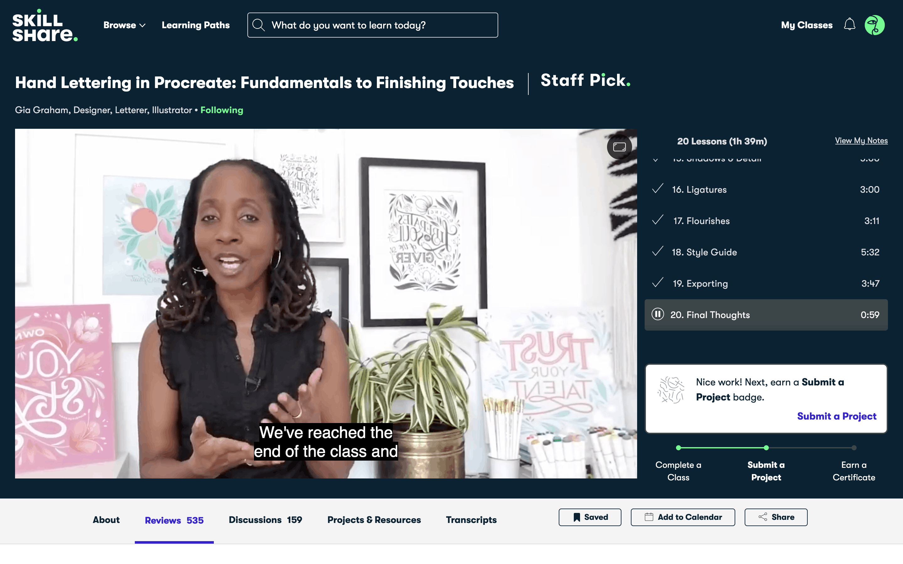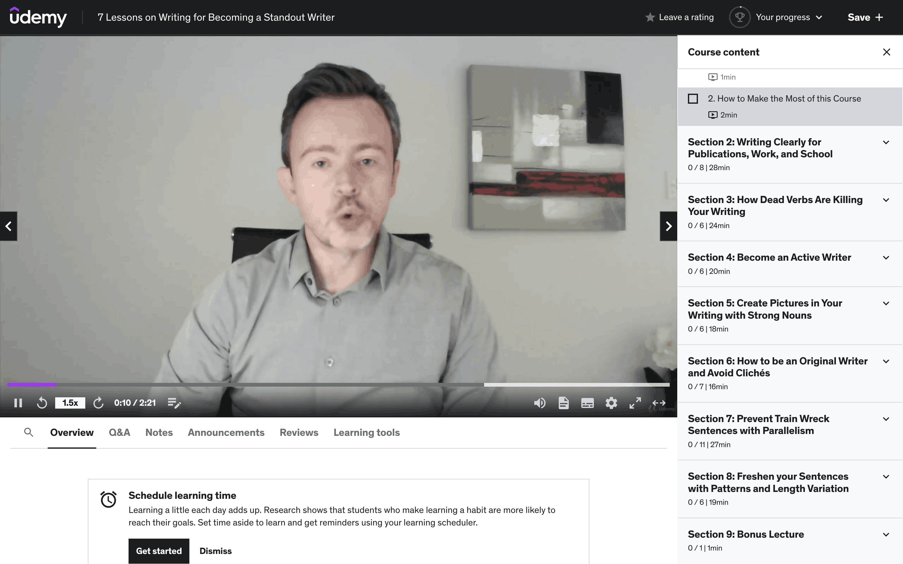 The user watches a lesson, sees the 'up next' screen, and then starts the next lesson. The course content updates to reflect progress.