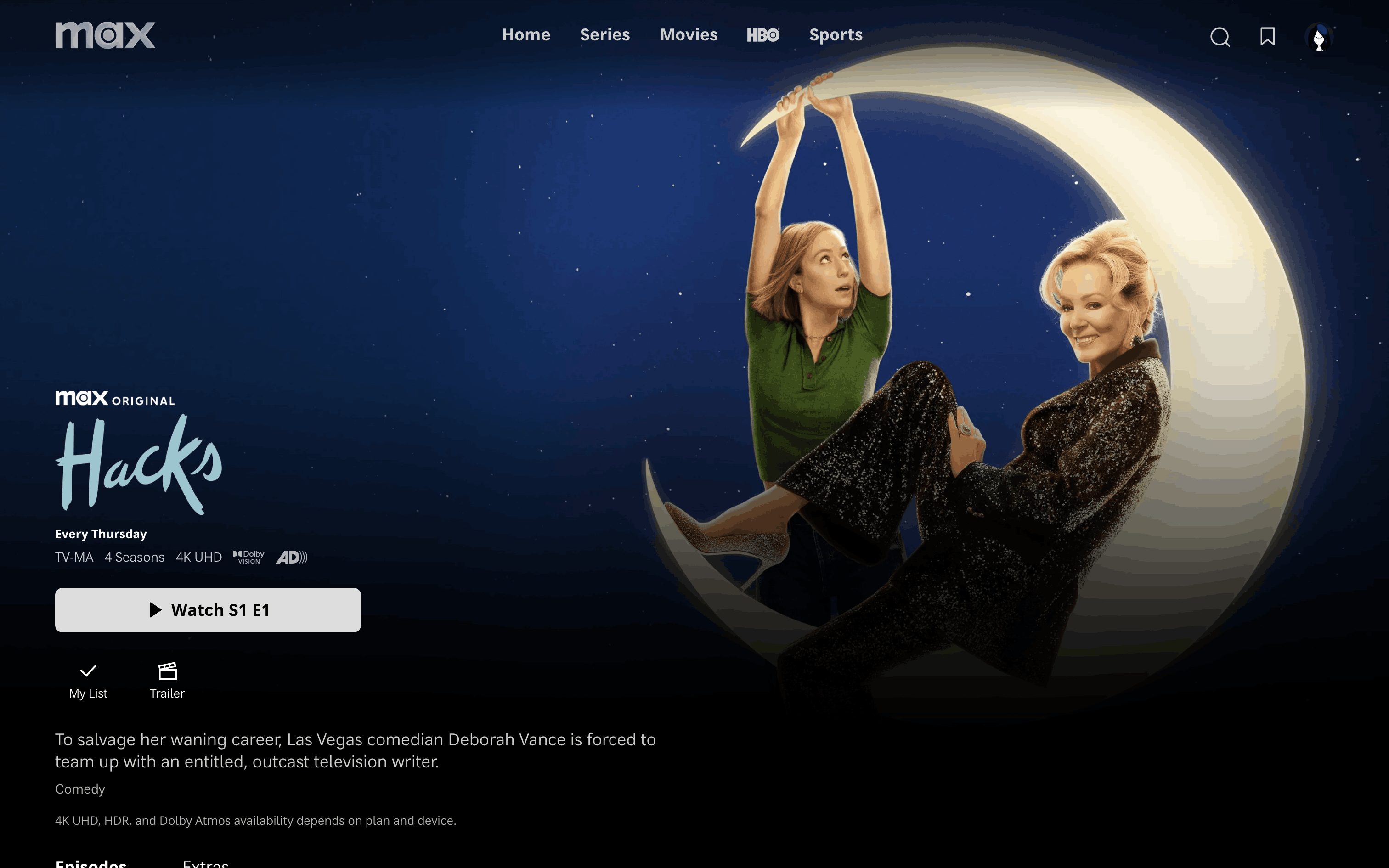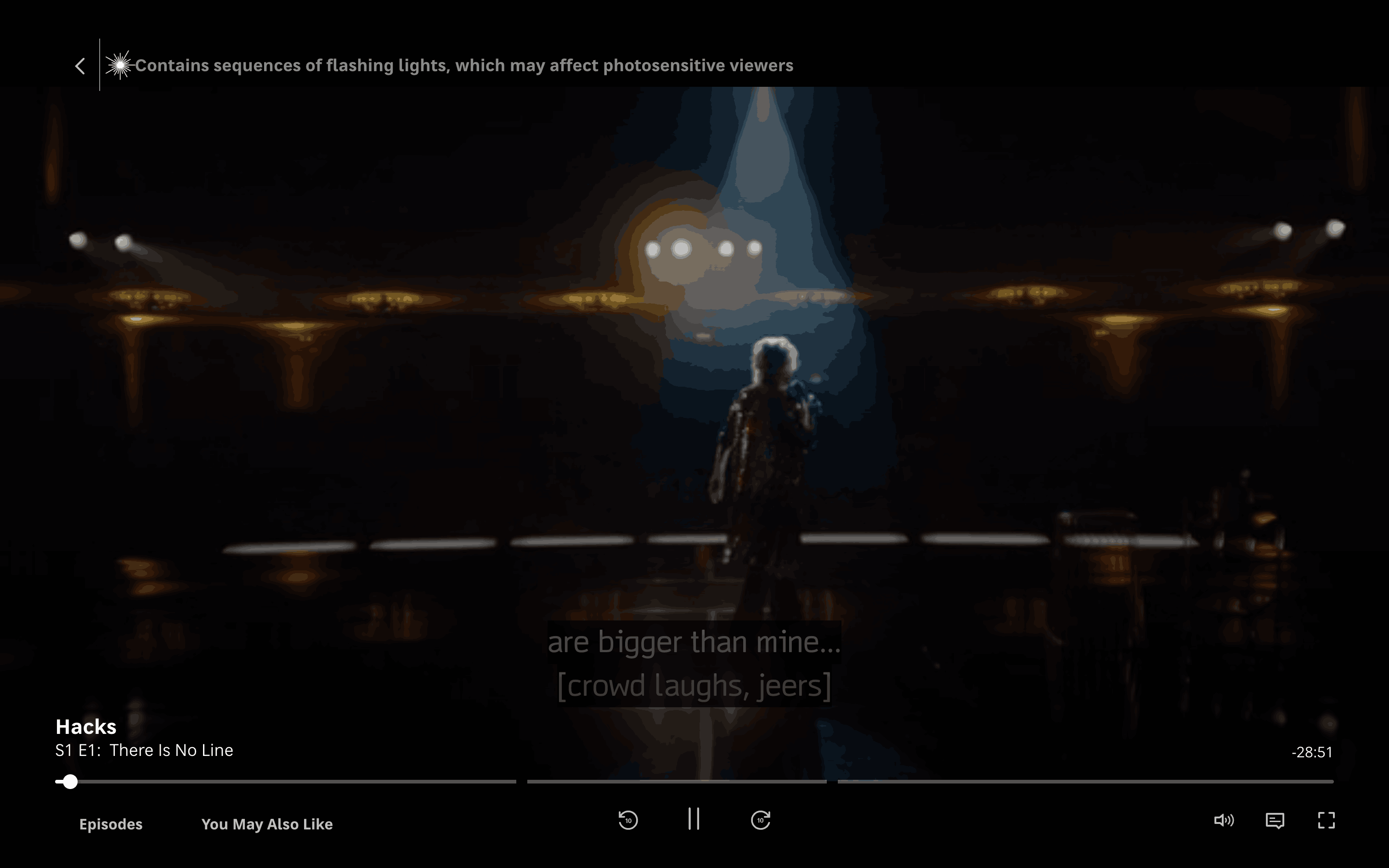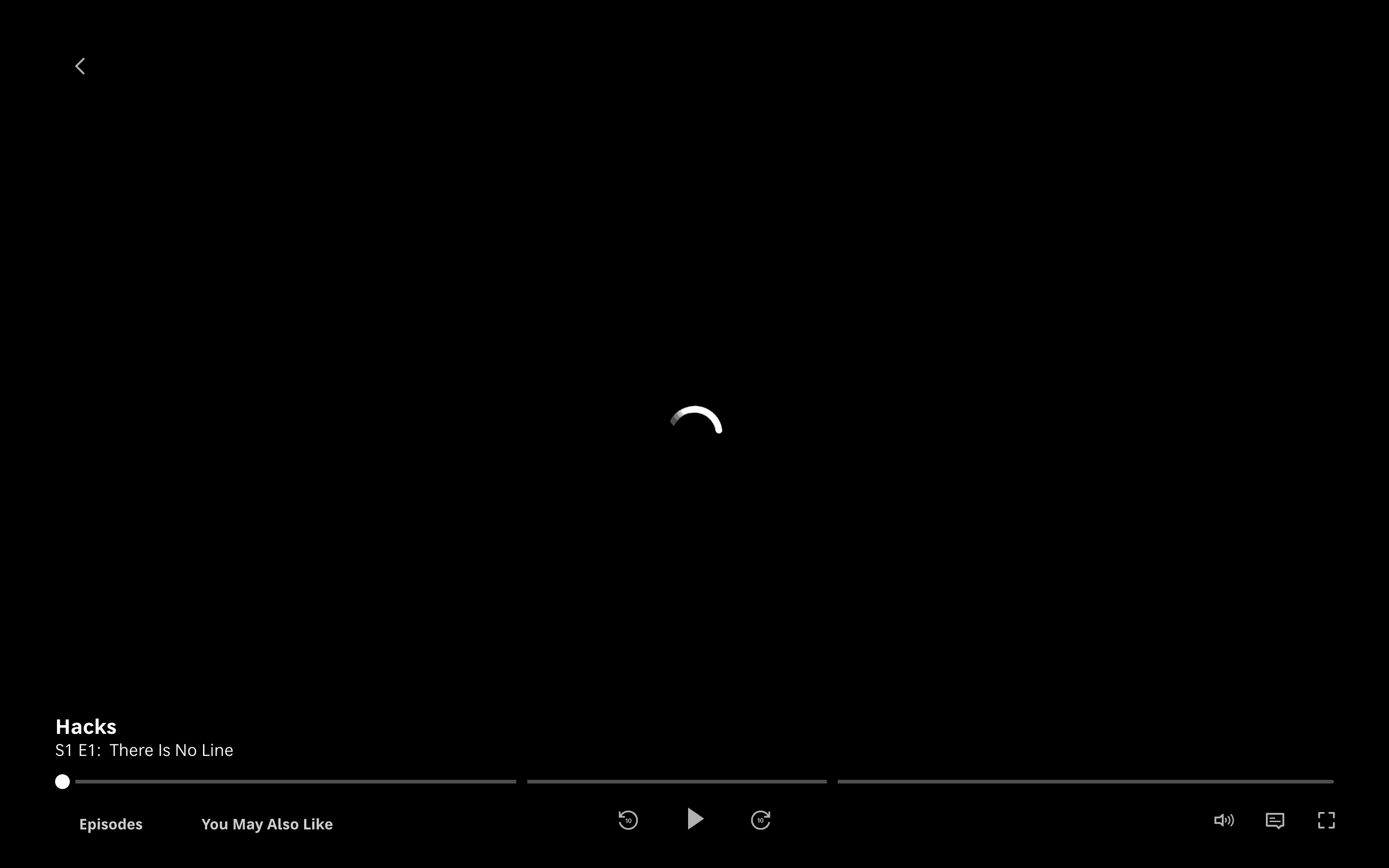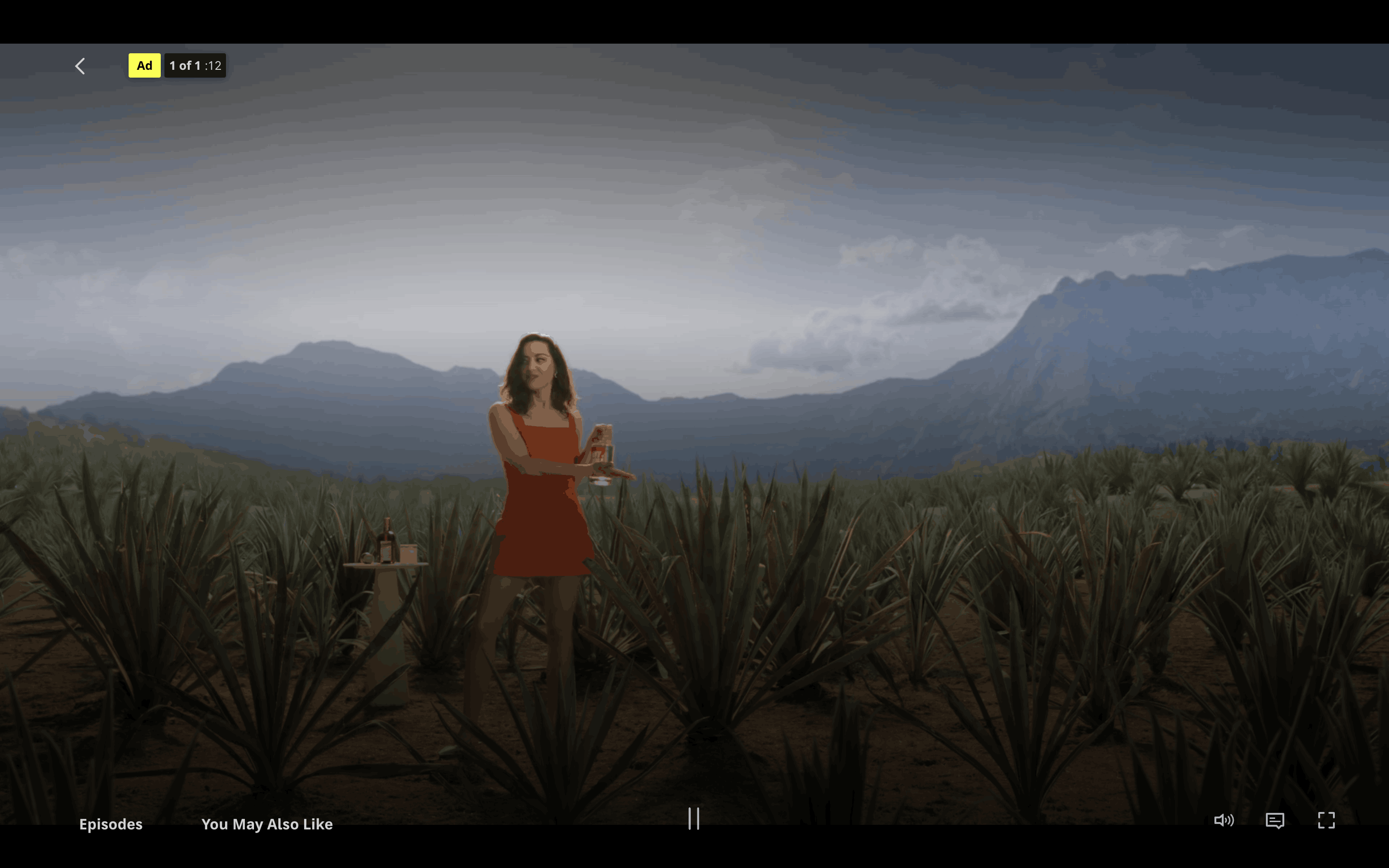 The user navigates from a show landing page, through a loading screen and advertisement, to finally reach the video playback. The flow is initiated by clicking the "Watch" button.