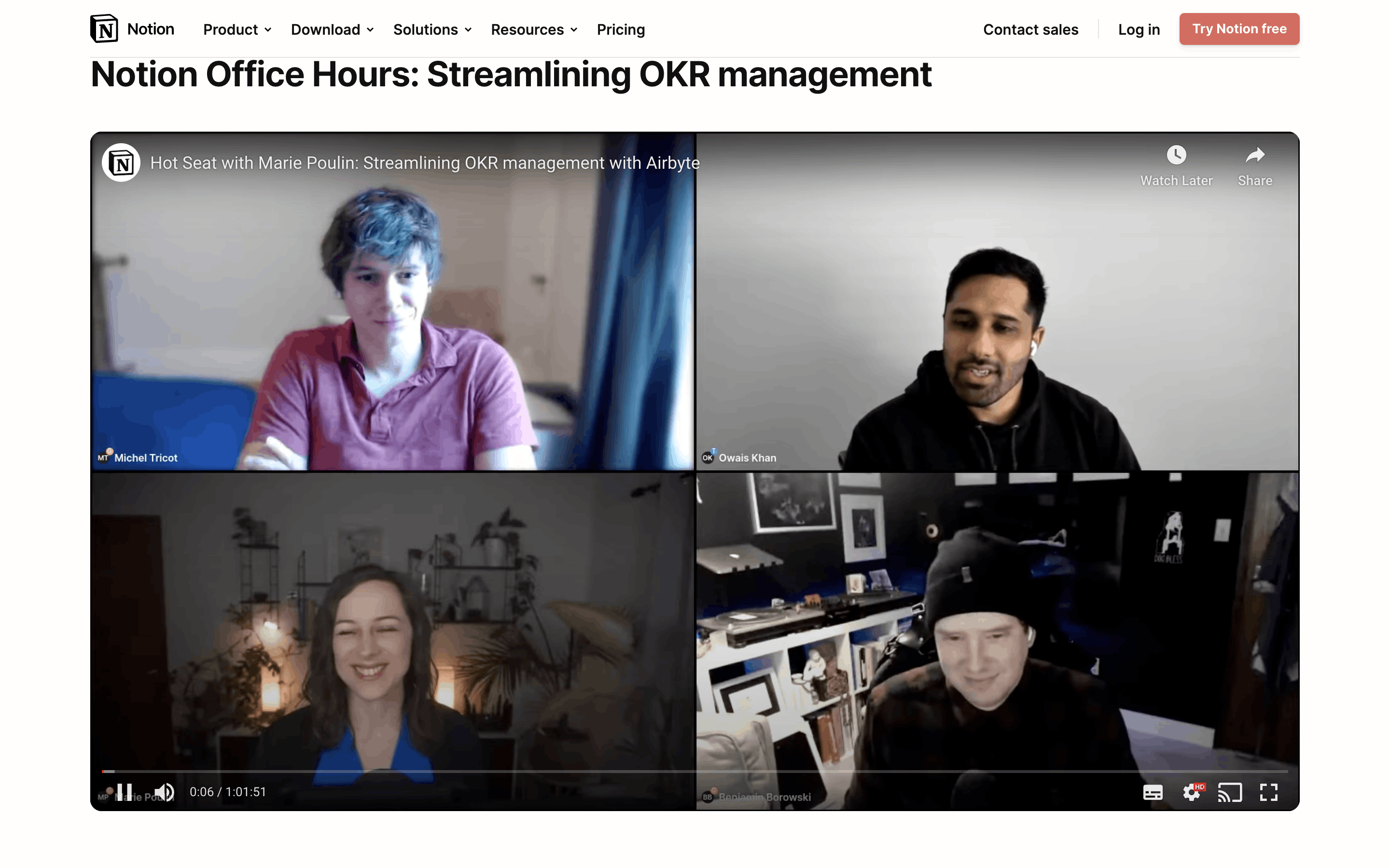 The user navigates from an email to a tutorial, watches it, and then views the same video embedded on a knowledge page. The goal is to learn from the video tutorial.