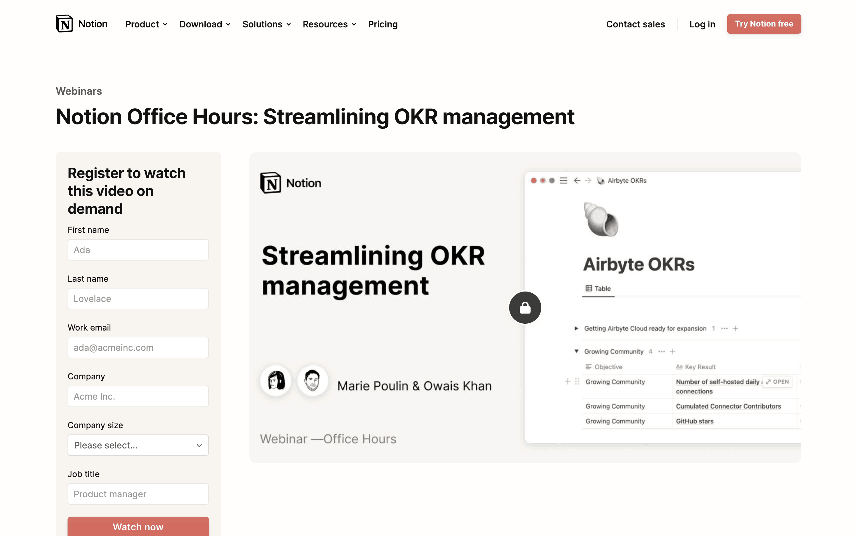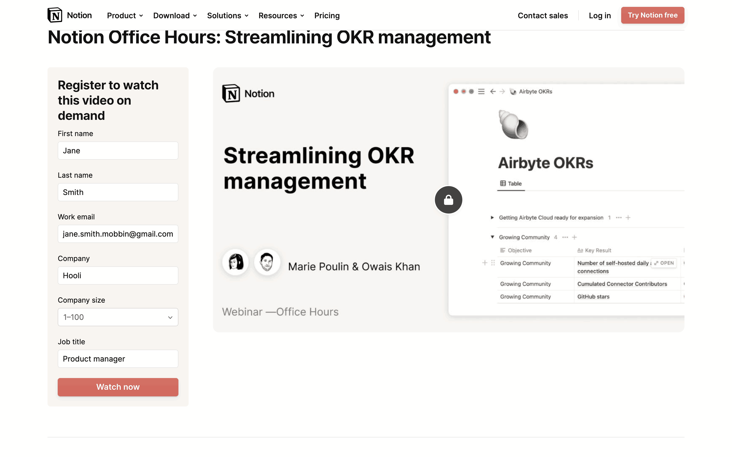 The user browses previous webinars, registers for one, and then watches the webinar. The flow involves filling out a form and then viewing the video content.