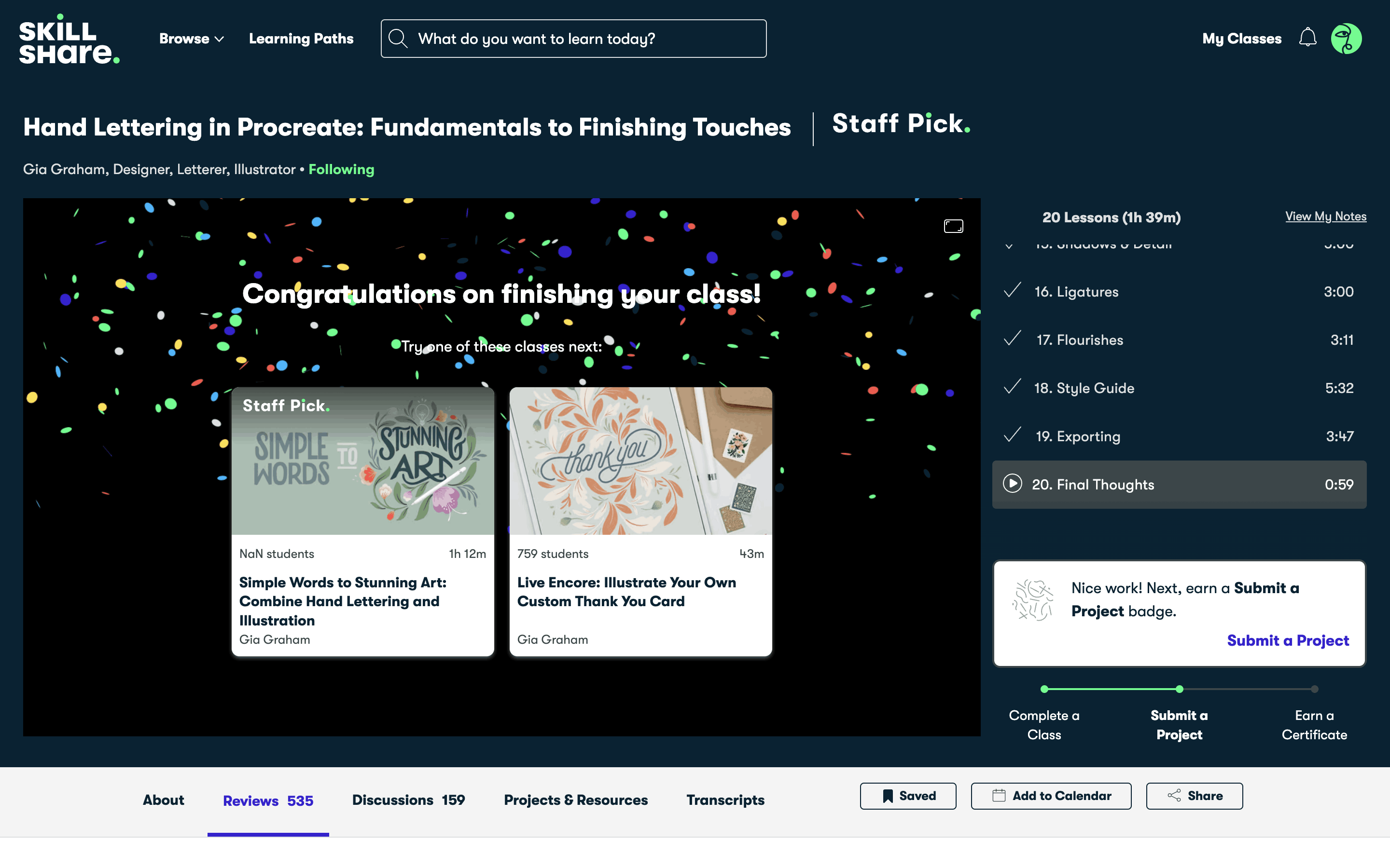 The user views a class, watches the lessons, and then completes the class. The flow ends with a congratulations message and suggestions for other classes.
